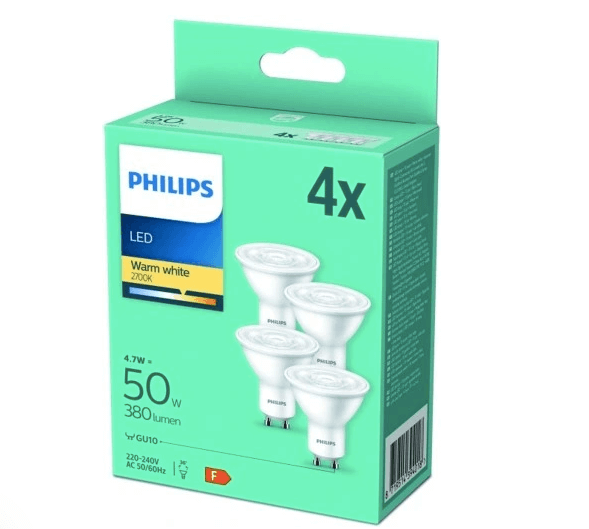 4x Żarówka GU10 Philips LED 4,7W = 50W / 380 lumenów / barwa 2700K / 36°