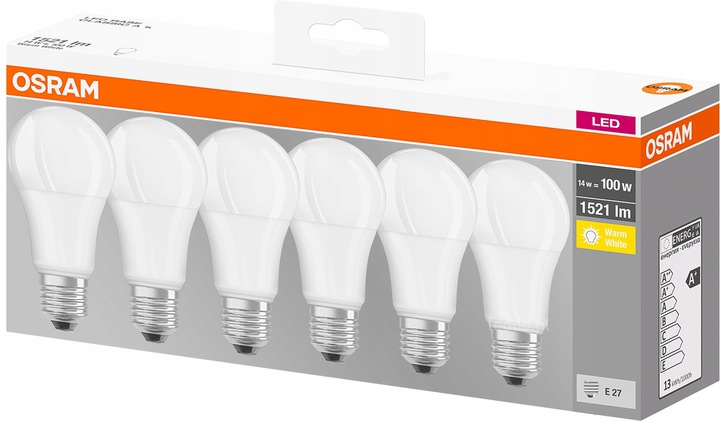 Zestaw 6x Żarówka LED mleczna marki OSRAM. Nowoczesne i energooszczędne źródło światła o mocy 14W (odpowiednik 100W) z tradycyjnym trzonkiem (gwintem) E27. Dzięki czemu wymiana żarówki jest bardzo prosta. Co więcej żarówka o tradycyjnym kształcie. Mleczny klosz emituje ciepłą barwę światła 2700K, zaś jej strumień świetlny wynosi 1521lm.
