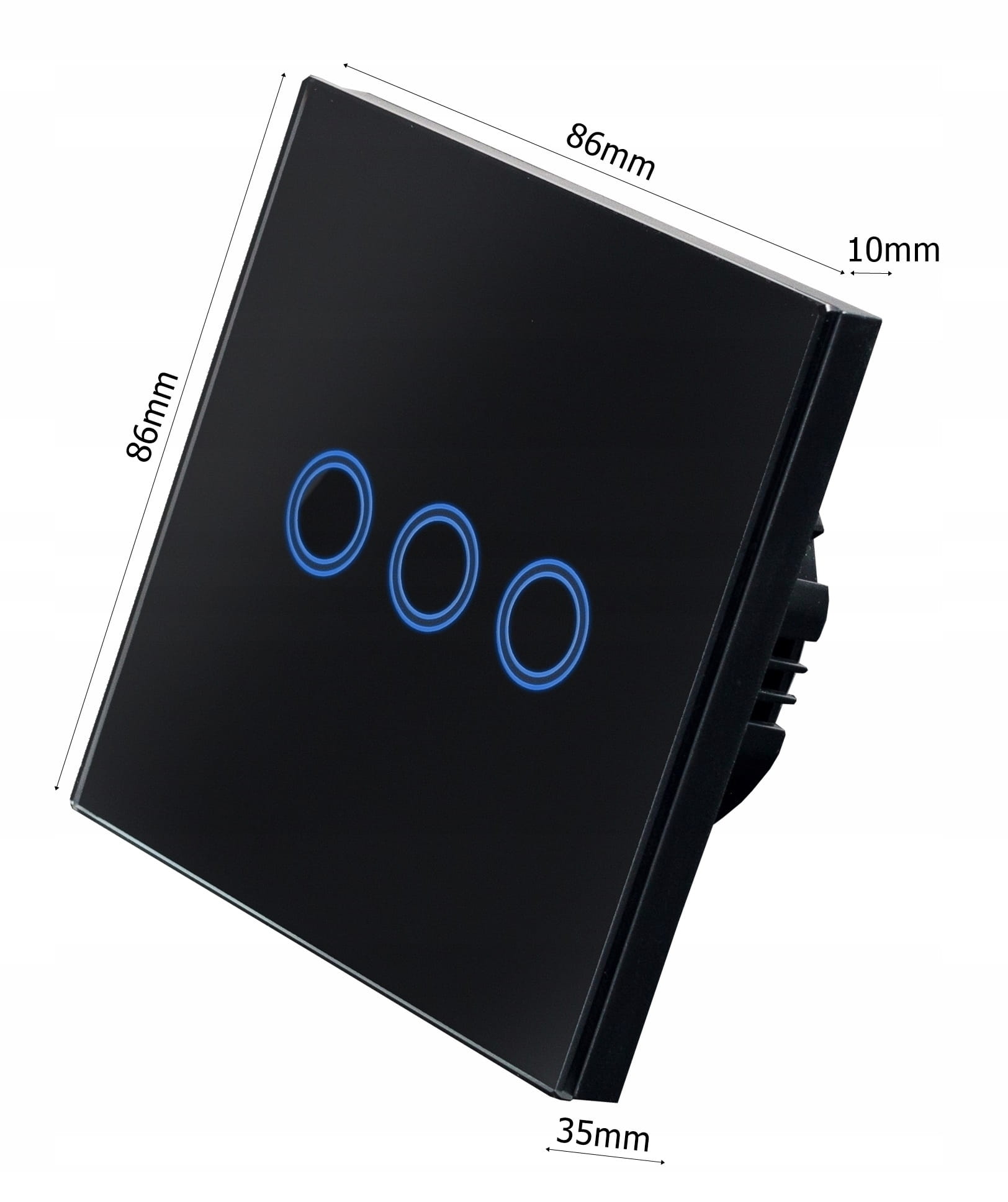 Panel zostały wykonany ze wzmocnionego szkła, odpornego na odbarwienia. Powierzchnia łatwa w czyszczeniu. Element dotykowy jest bardzo czuły, gdy jest wyłączony podświetla się na niebiesko. Do zestawu dołączony jest adapter LED, który pozwala zastosować włącznik nawet dla lamp z diodami LED. Włącznik pasuje do standardowej puszki okrągłej 60 mm.