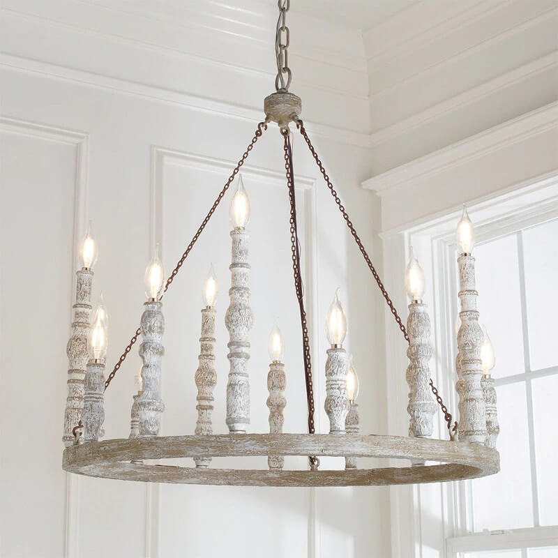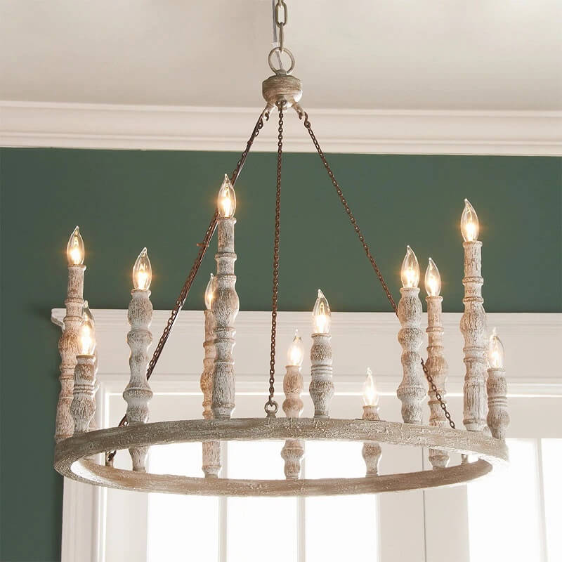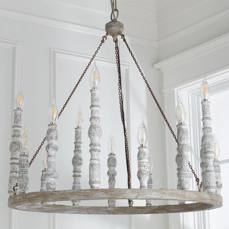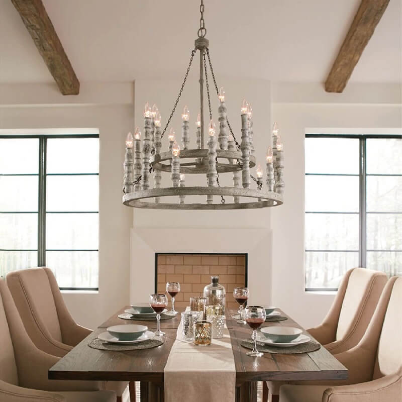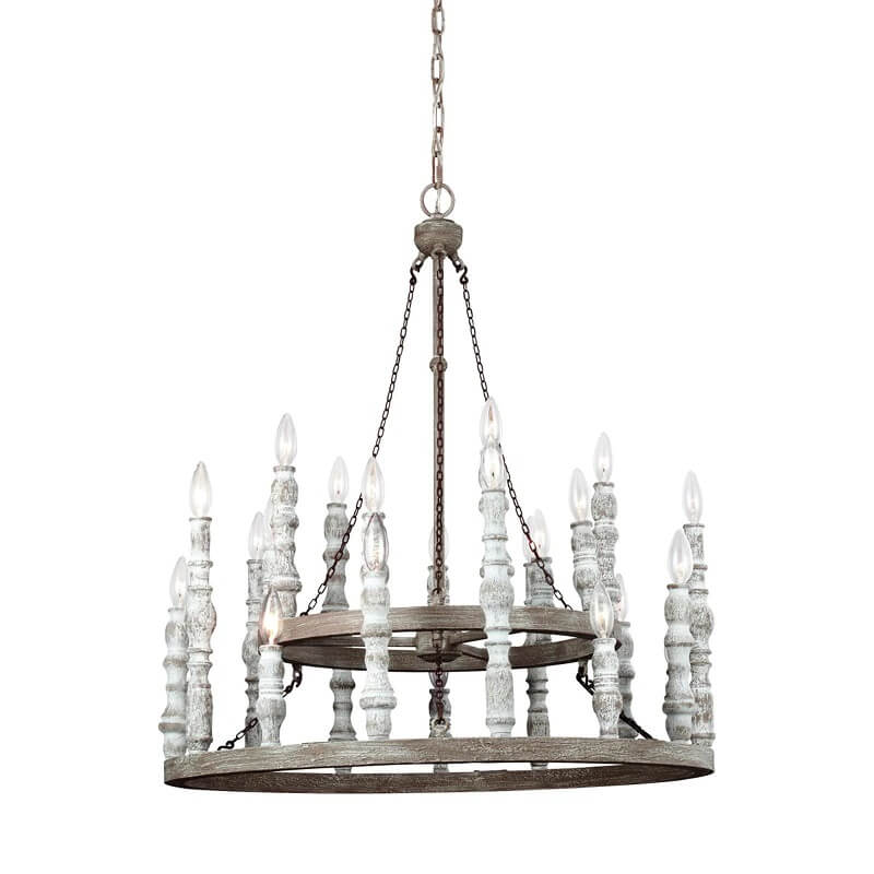 Ten wspaniały drewniany żyrandol Feiss Norridge o rustykalnym designie wypełni wnętrze uroczystym światłem. Delikatny kolor szarości, w którym utrzymane jest drewno, współgra z wieloma kompozycjami kolorystycznymi. Żyrandol podświetla 15 lub 24 lampek w kształcie świec. Najpiękniej wyglądać będą żarówki płomyki.