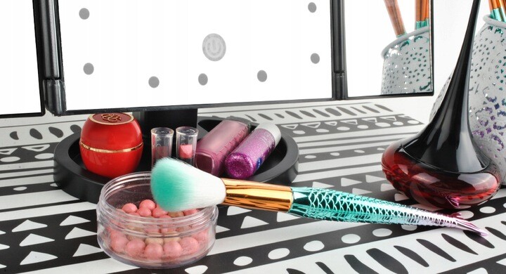 - REGULACJA NACHYLENIA – dzięki możliwości regulacji nachylenia lusterka w zakresie aż 180° w prosty sposób można dostosować jego ułożenie do własnych, aktualnych potrzeb oraz preferencji. Nie musisz podnosić lusterka i przestawiać go na wyższe i niższe półki, by wykonać perfekcyjny makijaż – wystarczy wyregulować kąta nachylenia, a przy okazji doskonale doświetlisz każde miejsce twarzy. Lusterko można również ustawić w pozycji poziomej do 90°.