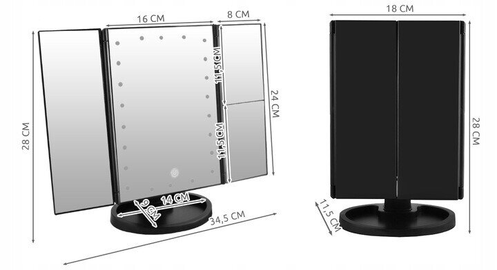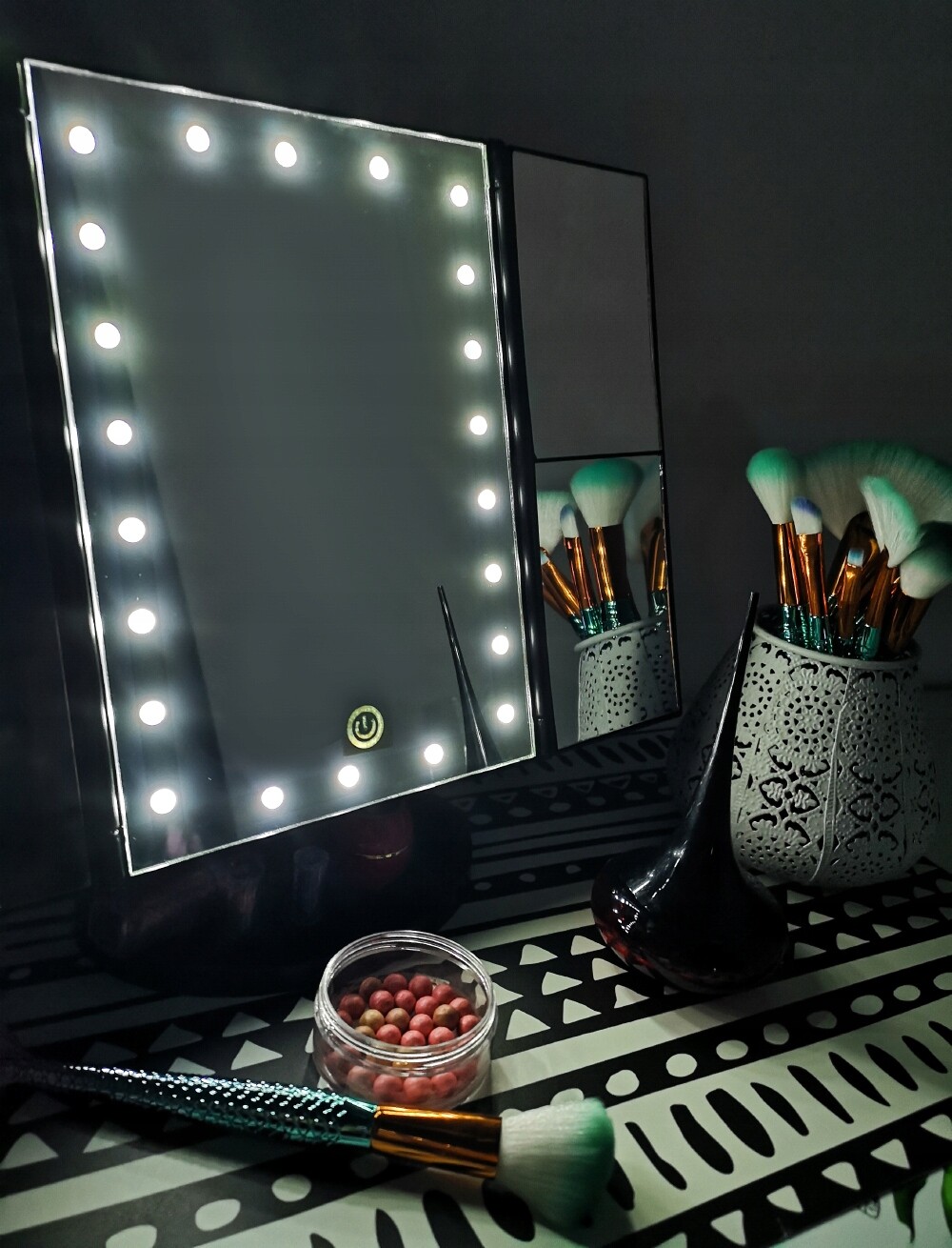 - 22 DIODY LED – lusterko posiada aż 22 diody LED, które ustawione są na jego obrzeżach. Takie ustawienie diod pozwala na pełną widoczność każdej części twarzy, dekoltu czy szyi. Intensywność oświetlenia diod można regulować za pomocą dotykowego przycisku, który znajduje się na dole lusterka.