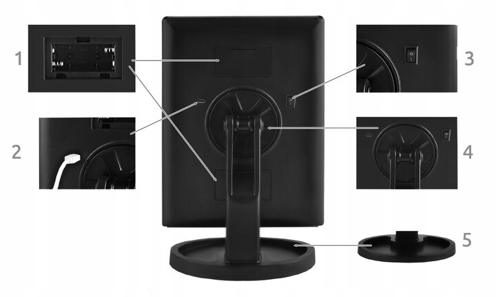 - zasilanie: 4 x bateria AA 1,5V (brak w zestawie) lub przewód micro-USB (w zestawie);