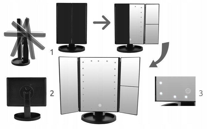 - 3 STOPNIE PRZYBLIŻENIA – otwierane lustro posiada dwa boczne lusterka, po lewej stronie mamy zwykłe lusterko bez powiększenia, natomiast po prawej stronie znajduje się dwukrotne oraz trzykrotne powiększenie. Powiększenie jest sporym ułatwieniem podczas wykonywania makijażu czy zabiegu. Nie musimy bardziej przysuwać się do lusterka, by zrobić idealnie równą kreskę nad okiem, wystarczy skierować wzrok na boczne lusterko i wykonać makijaż.
