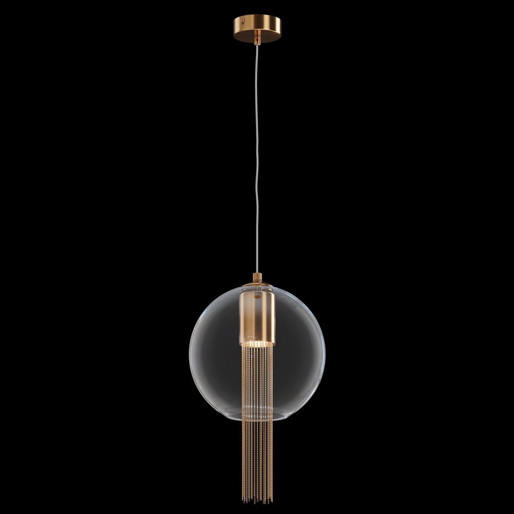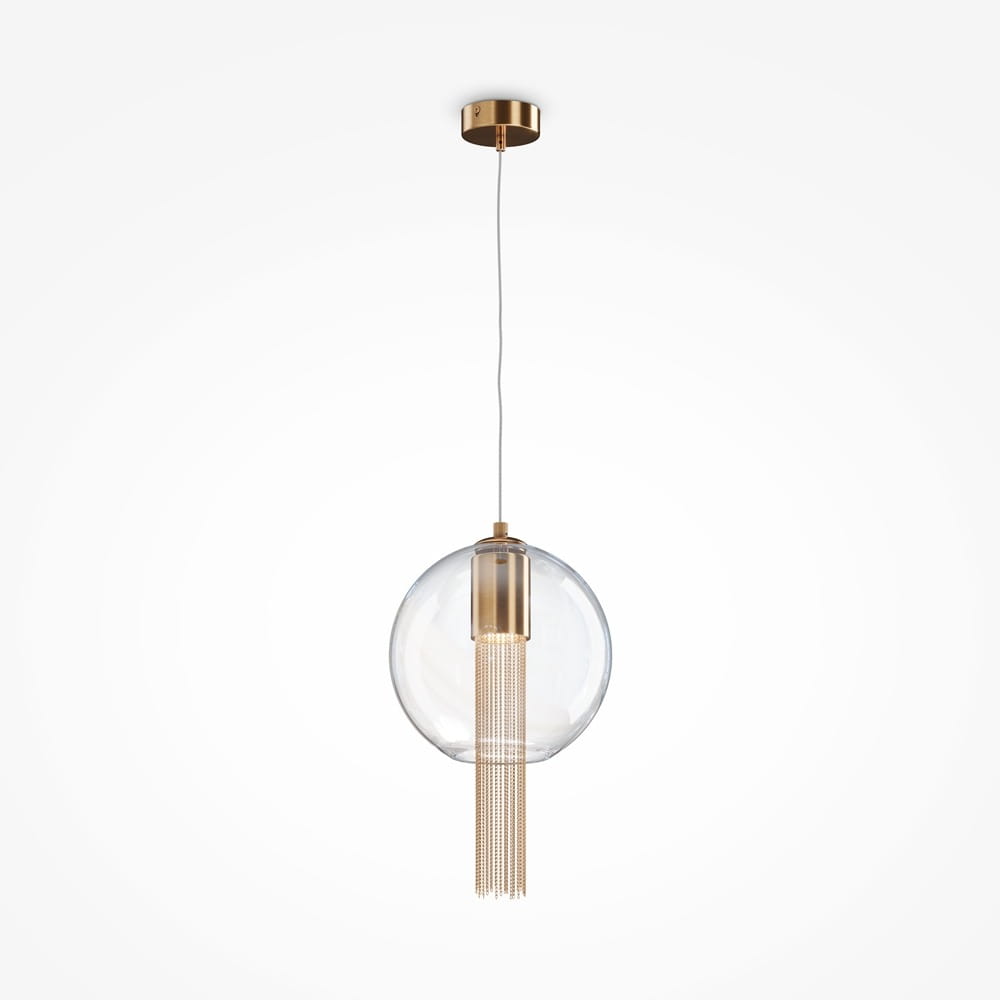 Lampa wisząca 1 punktowa ze szklanym kloszem, wewnątrz którego umieszczono metalowe łańcuszki. Elementy metalowe wykończone w kolorze brązowym.