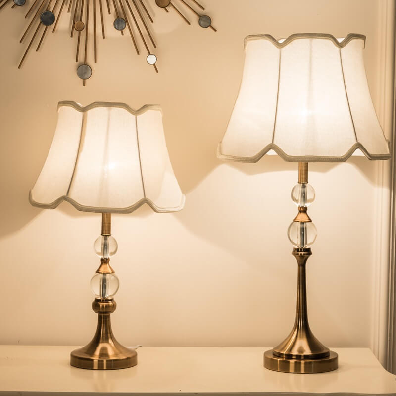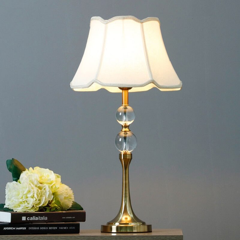 Elegancka lampa stołowa z tkaninowym abażurem i szklanymi kulami – klasyczne oświetlenie do salonu, sypialni i gabinetu