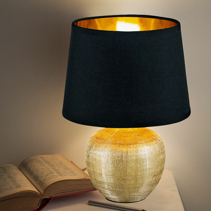 Oświetlenie cechuje się funkcjonalnością i praktycznością. Gustowne połączenie kolorów oprawy: czarny – złoty i zastosowanych w oprawie materiałów: ceramika – tkanina sprawi, że lampa znajdzie zastosowanie zarówno w ciemnych, jak i w jasnych wnętrzach. Wysoka jakość wykonania i ergonomiczna konstrukcja lampy zagwarantuje łatwość w utrzymaniu czystości oraz zadowolenie na wiele lat. Wybierając ten model, zyskasz zachwycającą i cieszącą oko dekorację, która nada przestrzeniom niepowtarzalnego wyglądu i elegancji.