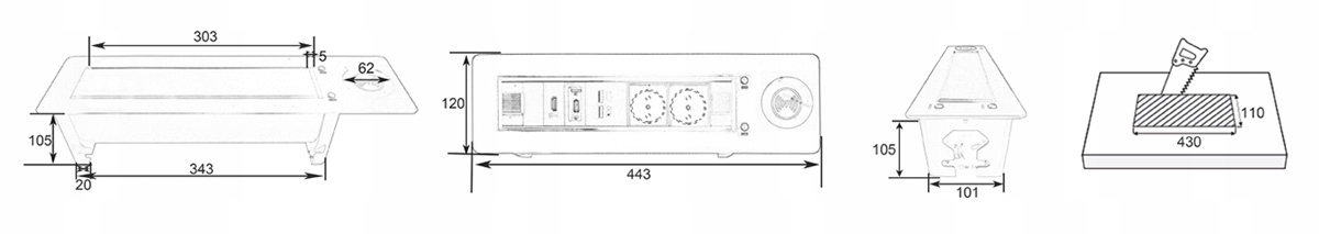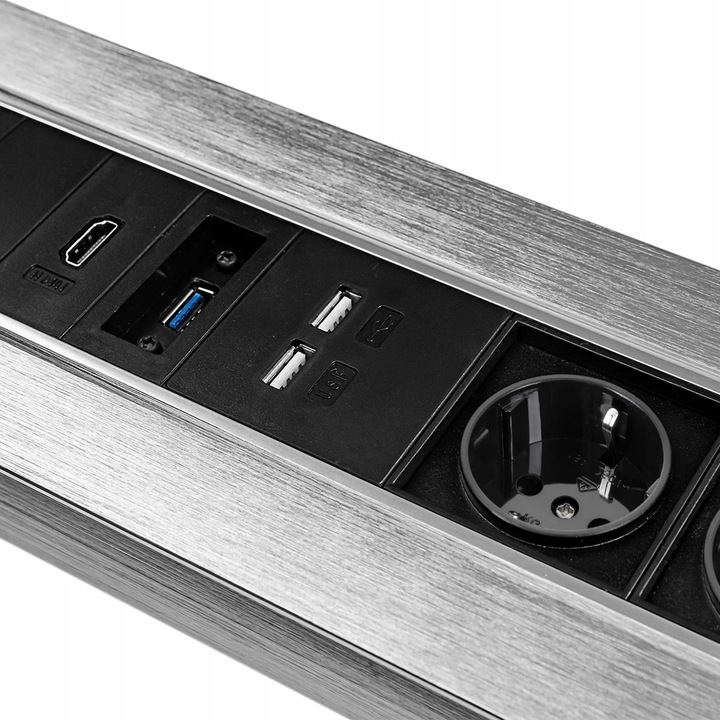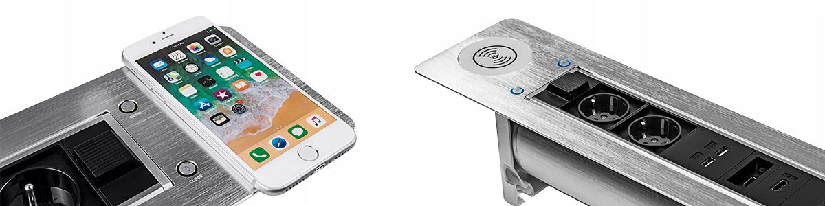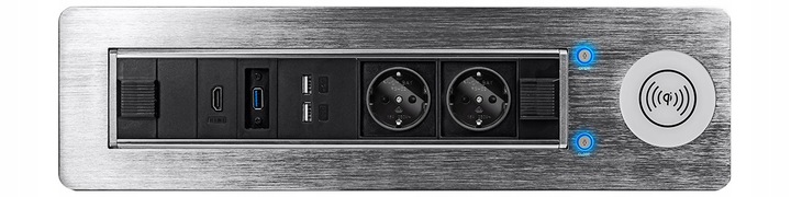 Elektryczny mediaport to nowoczesne rozwiązanie, które znajduje zastosowanie w sklepach, salonach sprzedaży, salach konferencyjnych, biurach, a także w domu. Jedno naciśnięcie przycisku spowoduje, że gniazda płynnie się odkryją. Wykonany z aluminium i wysokiej jakości komponentów. Produkt jest przeznaczony do montażu wewnątrz pomieszczeń w biurkach, blatach i stołach, zarówno w pozycji pionowej, jak i poziomej, zapewniając dostęp do gniazd. Mediaport został wyposażony w 2 gniazda 110-250 V (typ Schuko), podwójną ładowarkę USB, gniazdo HDMI 2.0, USB 3.0 oraz ładowarkę indukcyjną, dzięki której bez użycia kabli naładujesz swoje urządzenie mobilne.