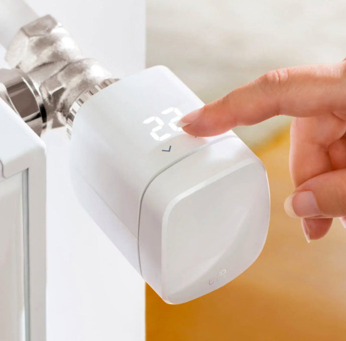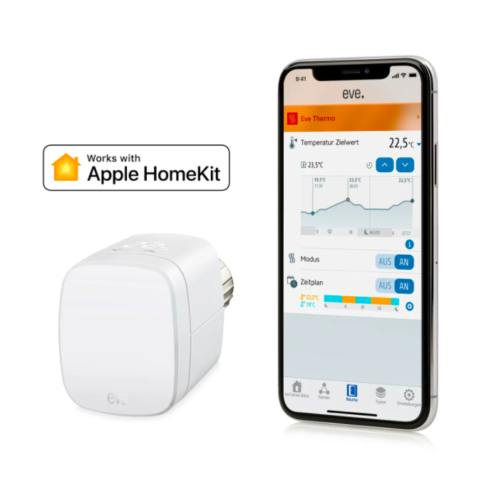 Termostat grzejnikowy Eve Thermo, który otrzymał nagrodę Red Dot Design Award 2018. Umożliwia inteligentne, nowoczesne ogrzewanie w sposób bardzo indywidualny i intuicyjny. Termostat jest łatwy w montażu i może być używany natychmiast, bez dodatkowego mostka, m. in. z wykorzystaniem iPhone`a oraz bezpłatnej aplikacji Eve Poszczególne termostaty można przyporządkować do odpowiednich pomieszczeń, a ogrzewanie można regulować na przykład z wykorzystaniem indywidualnych harmonogramów dziennych. Wciąż możliwe jest też odczytanie temperatury na samym grzejniku i sterowanie nią bez użycia aplikacji. Ustawienie żądanej temperatury – bardzo wygodne i bez wstawania – umożliwia także sterowanie głosem przy wykorzystaniu Siri.