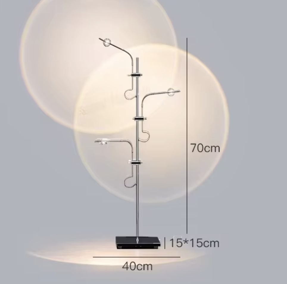 Wyjątkowa lampa LED o formie przypominającej futurystyczne drzewko świetlne. Smukły, chromowany stelaż z odchodzącymi ramionami zakończonymi reflektorkami LED tworzy niepowtarzalny efekt wizualny. Każde źródło światła można skierować w inną stronę, dzięki czemu lampa pełni funkcję zarówno dekoracyjną, jak i praktyczną. Doskonała do wnętrz urządzonych w stylu nowoczesnym, industrialnym, loftowym lub futurystycznym. Może pełnić funkcję niezależnego oświetlenia, lampy czytelniczej (jedno ramię ustawione niżej) lub designerskiego elementu podkreślającego nowoczesny charakter pomieszczenia.