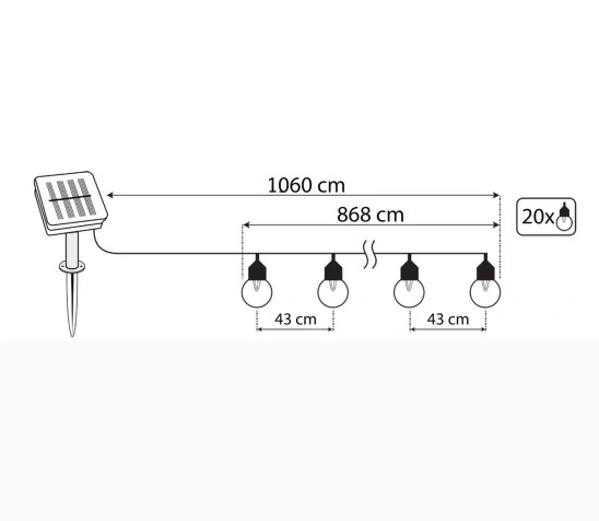 W przypadku pochmurnej lub deszczowej pogody panel można ładować przez USB, dzięki czemu z girlandy można korzystać nawet zimą, gdy nie ma wystarczającej ilości światła słonecznego. Posiada wymienne, filamentowe żarówki.