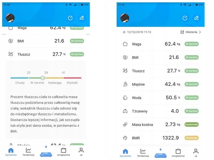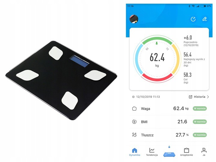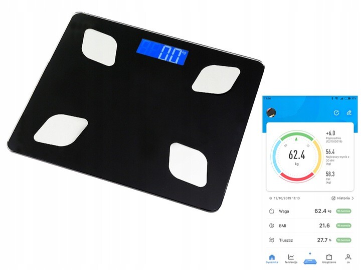 Dzięki tej wadze i zainstalowanej aplikacji dostępnej w języku polskim, możemy sprawdzić takie parametry jak: