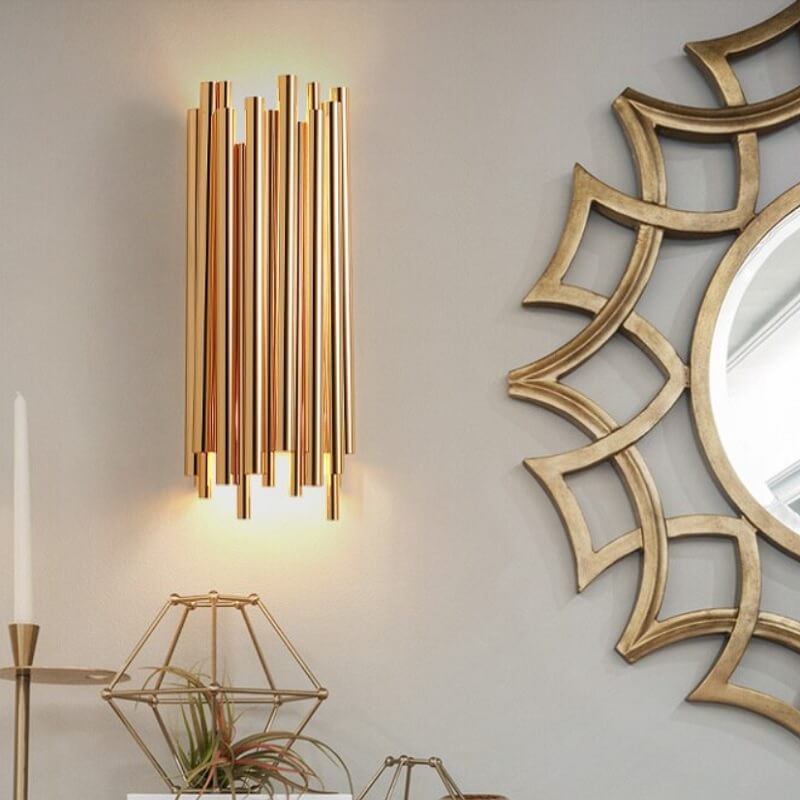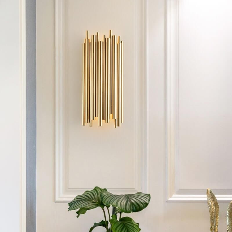 Kryształowa elegancka lampa ścienna Moosee Tube. Kinkiet w stylu glamour w kolorze złotym idealny do sypialni, salonu, korytarza.