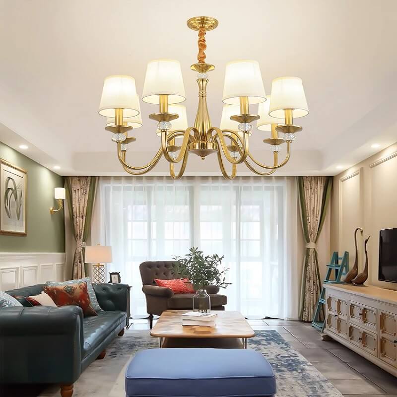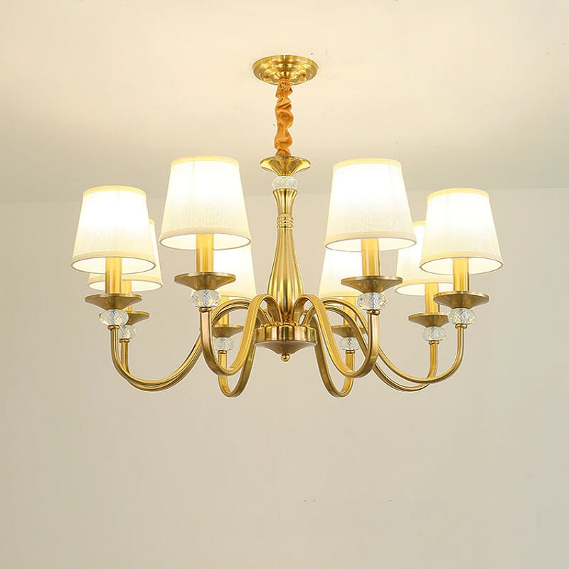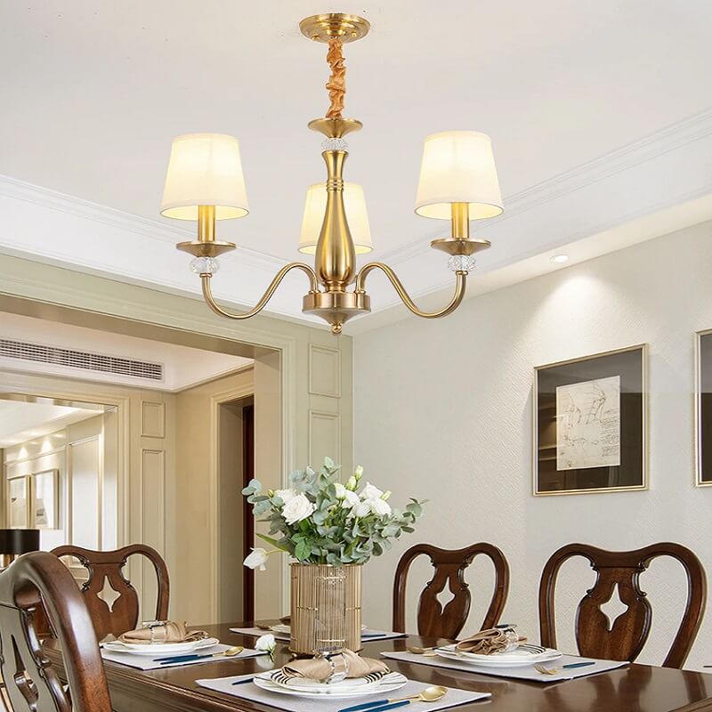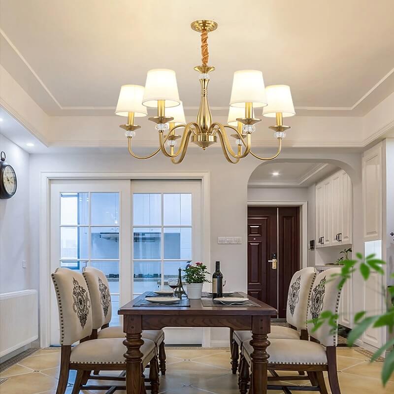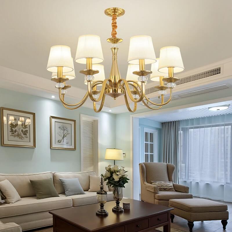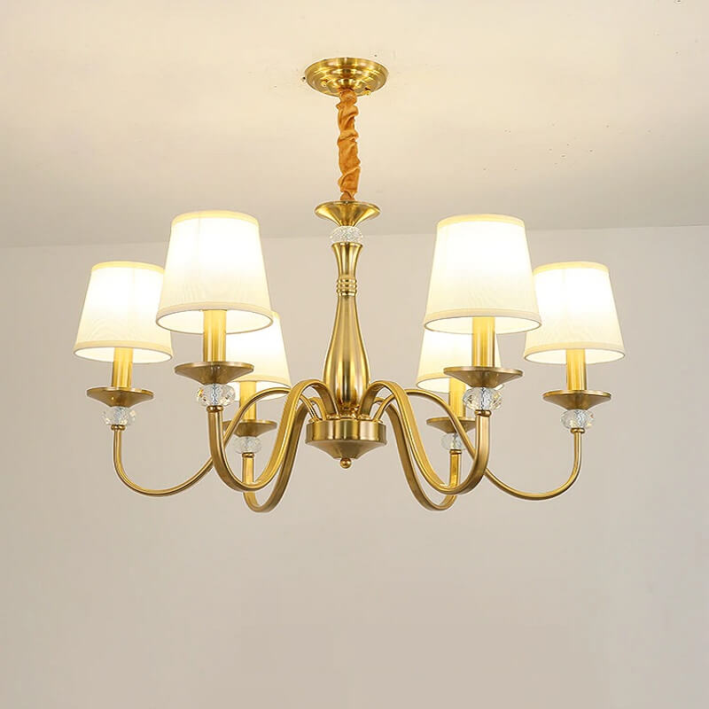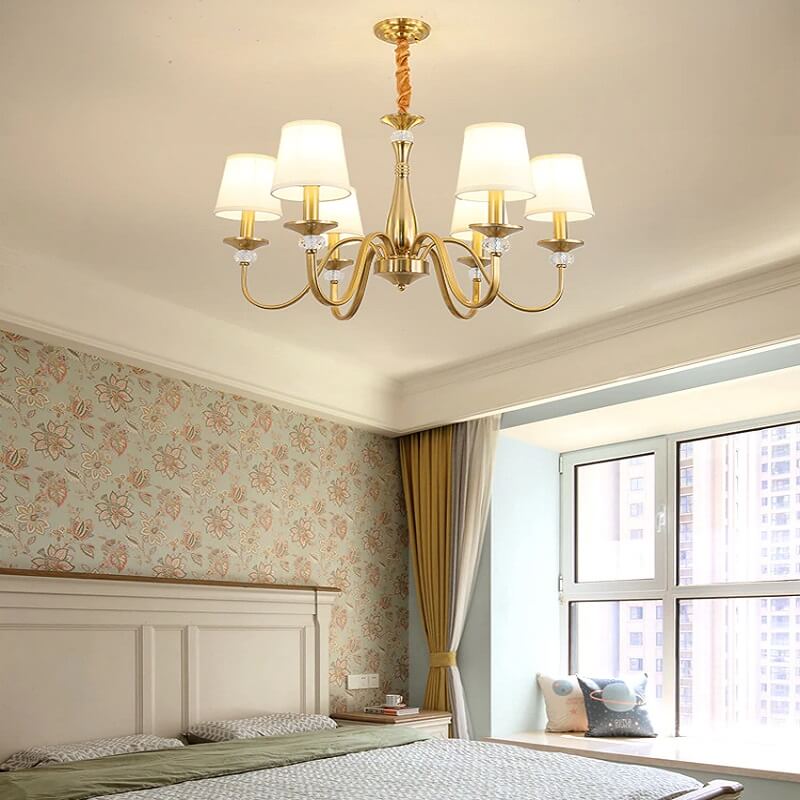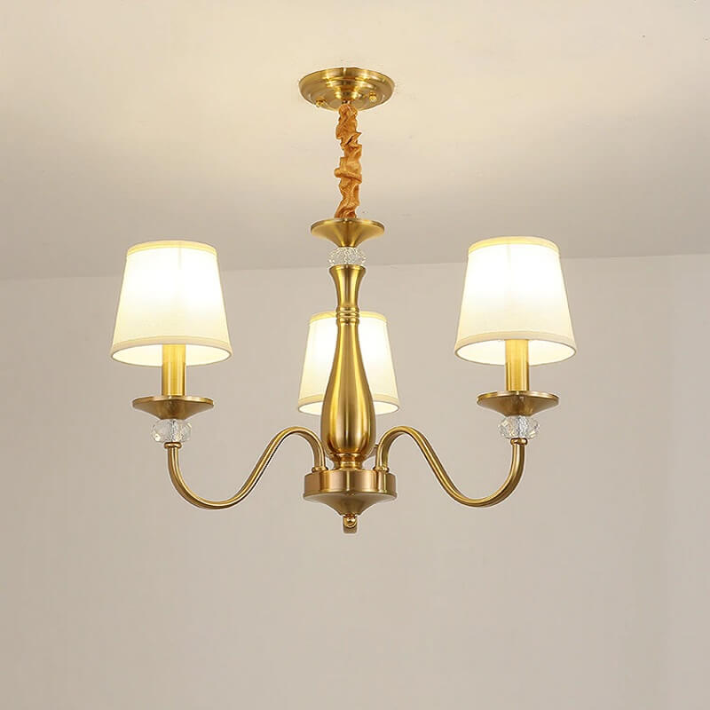 Klasyczna i elegancka lampa wisząca Calamaro w kolorze złotym. Żyrandol z abażurami idealny do sypialni, salonu, jadalni.