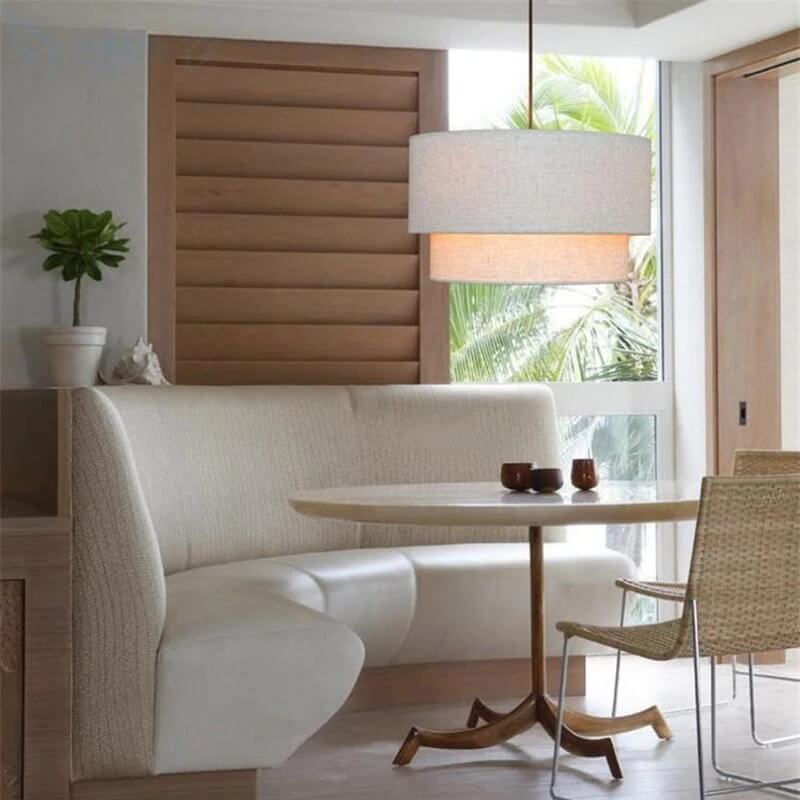 Naturalna lampa wisząca Canberra z dwuwarstwowym kloszem ma duży, pięknie ukształtowany klosz z tkaniny, który zachęca do patrzenia na niego pod wieloma różnymi kątami. Składa się on z dwóch elementów o różnych rozmiarach i zapewnia przyjemne, rozproszone światło dzięki swojej fakturze. Połączenie klosza wykonanego z materiału i zawieszenia z metalu tworzy bardzo miękki i ciepły język designu.