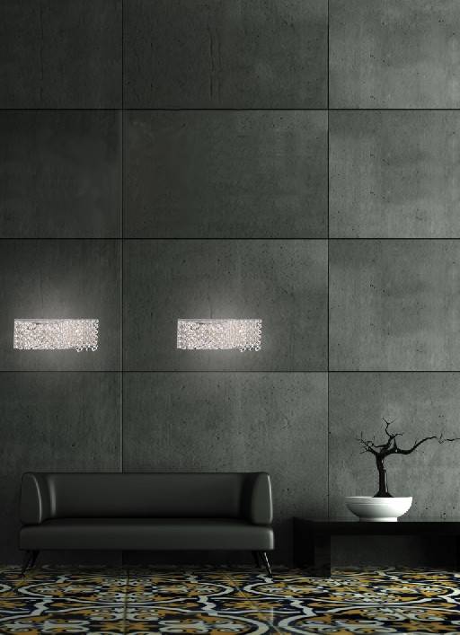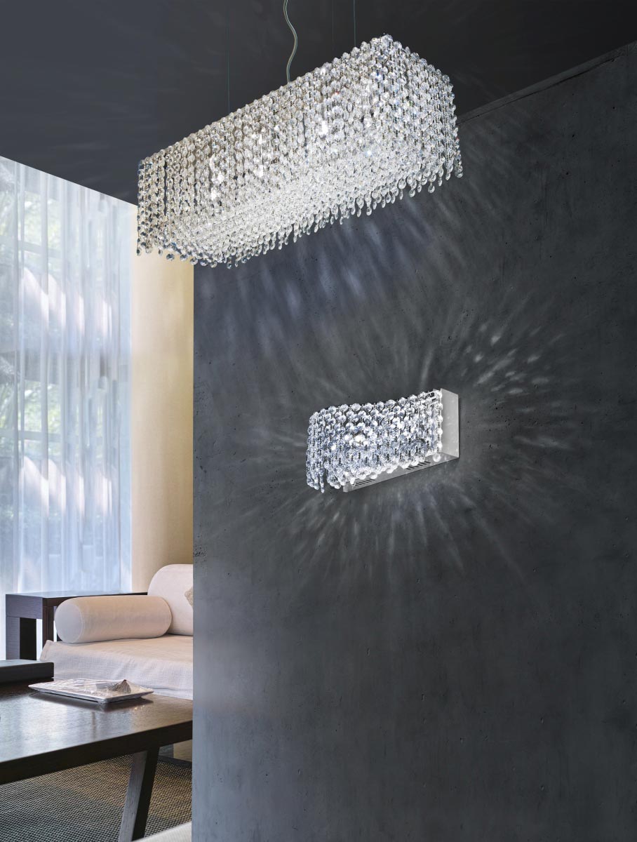 Nowoczesny kinkiet 2 punktowy z kloszem przyozdobionym egipskimi kryształkami. Elementy metalowe wykończone w chromie.
