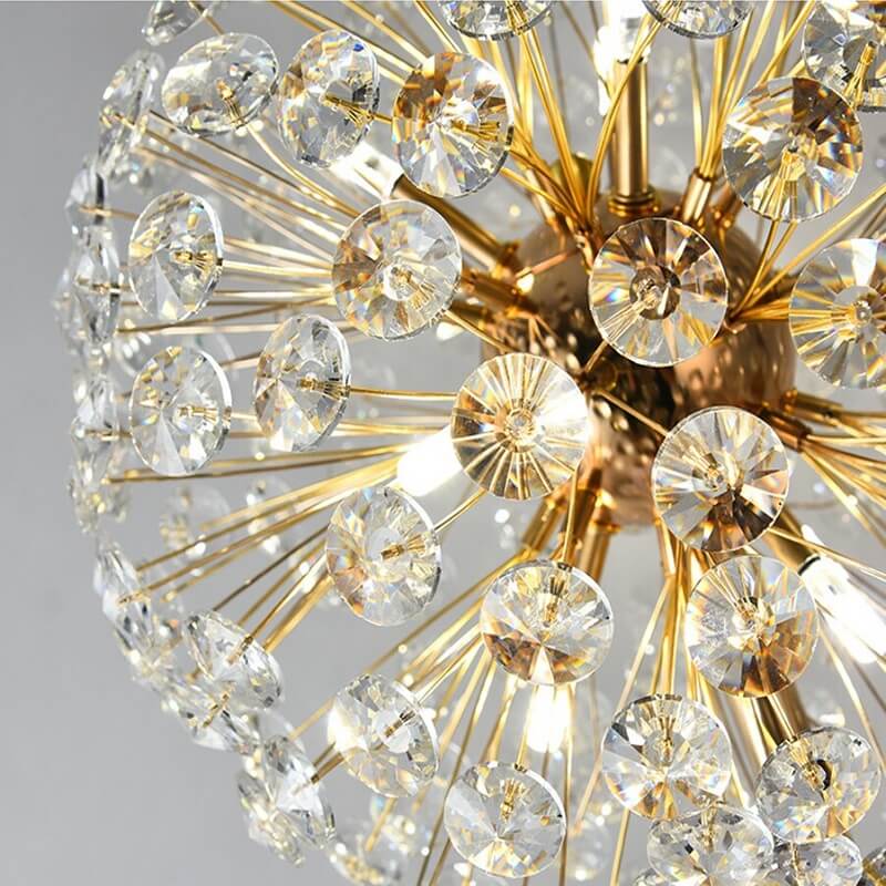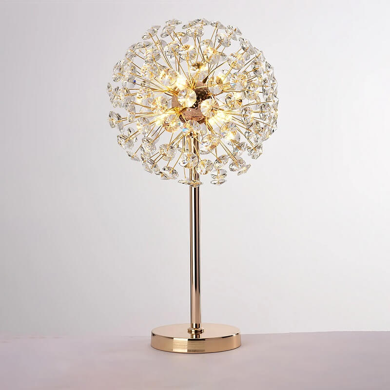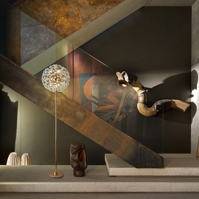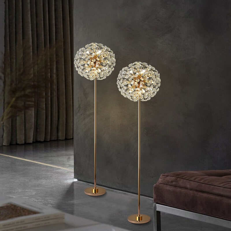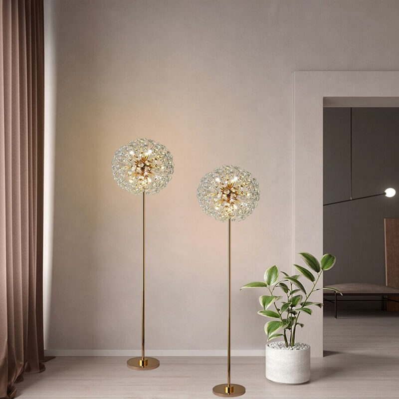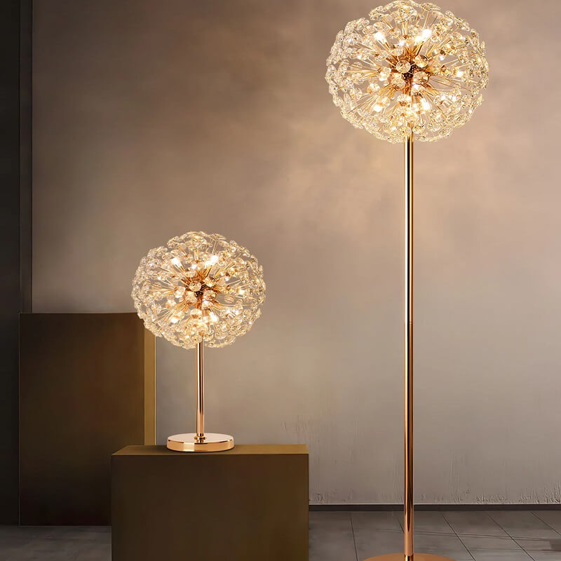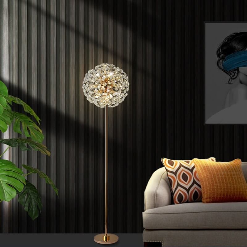 Kryształowa lampa stojąca Dmuchawiec to luksusowy element oświetlenia nadający uroku każdemu wnętrzu. Złoty korpus lampy przypomina łodygę, na której rozgałęzieniach znajdują się kryształy przypominające nasiona dmuchawca.