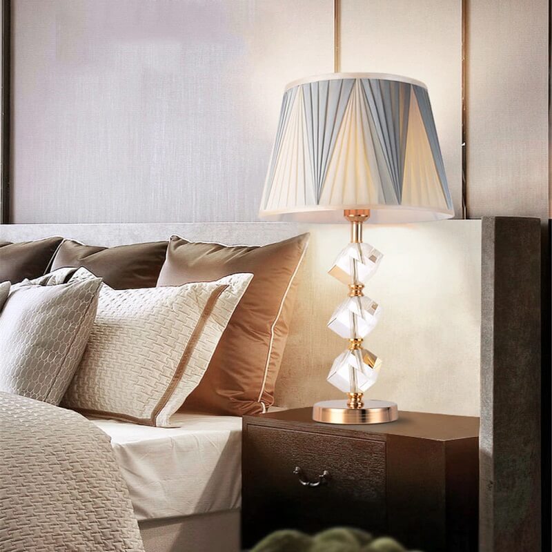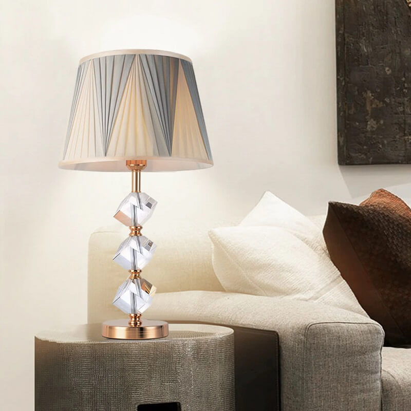 Lampa stołowa American Style – nastrojowa, luksusowa – produkt ponadczasowy i niezmiennie doceniany przez klientów. Lampa stołowa o eleganckim i szykownym wyglądzie, wykonana z dbałością o szczegóły. Lampa stołowa na stabilnej podstawie w kolorze złotym, plisowanym abażurem – doskonała spójność. Złota podstawa o tradycyjnym kształcie z kunsztownym zdobieniem – kryształową geometrią – gwarancja, iż piękna lampa stołowa stanie się jednym z najbardziej szykownych elementów wyposażenia.