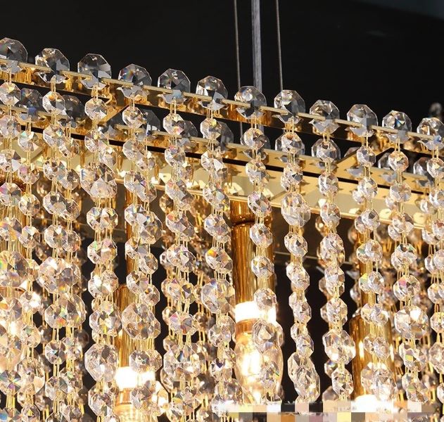 Nowoczesna Ekskluzywna Kryształowa Lampa Wisząca Prisma Żyrandol Glamour w Kolorze Złotym i Srebrnym. Lampa podłużna nad stół.