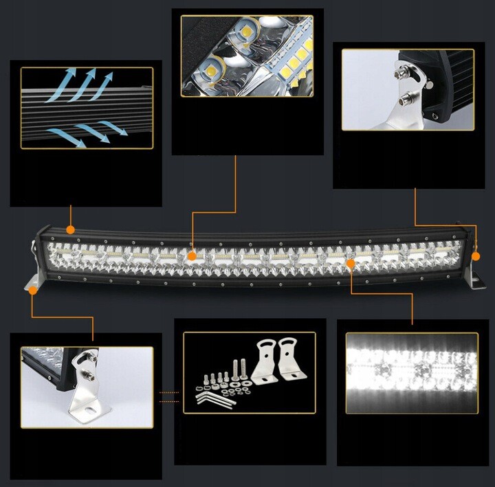 Lampa jest zakrzywiona, co powoduje większy promień doświetlenia pobocza. Klasa wodoodporności – IP68, co daje zakres temperatur: OD -40°C DO +65°C. Wykonanie: wodoodporne, pyłoszczelne, wstrząsoodporne. Obudowa: aluminium, stalowy uchwyt mocujący.
