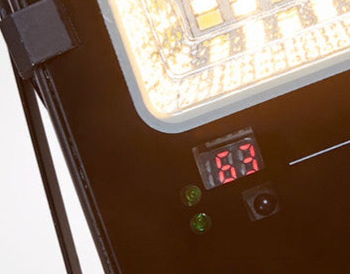 W lampie jest aż 660 sztuk bardzo wydajnych diod SMD 5730 nowej generacji! Zastosowano połowiczny podział, połowa diod jest w barwie zimnej 6000K, a druga połowa w barwie ciepłej 3000K, za pomocą pilota możemy zmieniać działanie lampy. Mianowicie regulujemy wedle uznania, na których diodach ma świecić lampa. Lampa może świecić zarówno na diodach zimnych i ciepłych naraz, co daje fenomenalny efekt naturalnego światła w barwie 4500K. W halogenie został zamontowany wskaźnik poziomu naładowania baterii, wyświetlacz wskazuje, jak dużo procent baterii jest naładowane w danym momencie!