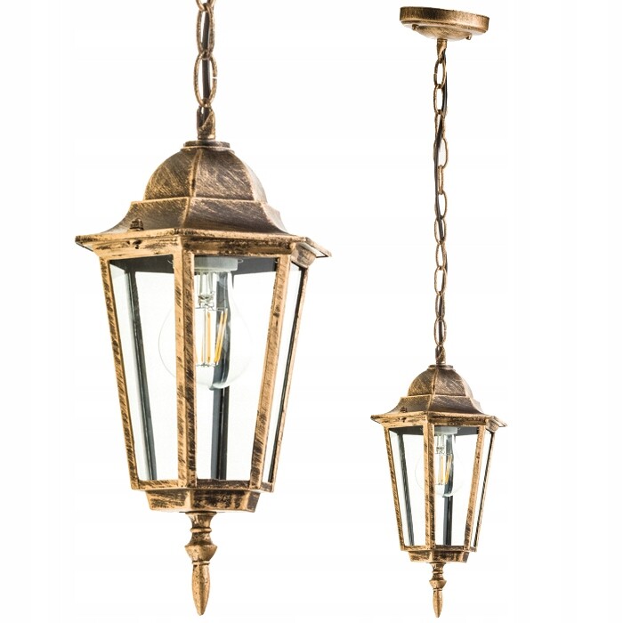 Lampa Wisząca zewnętrzna w kształcie latarni w kolorze patyny wykonana z wysokiej jakości stopu aluminium oraz szkła. Lampa z wymiennym źródłem światła została wyposażona w popularny trzonek E27 – maksymalna moc nie może przekraczać 12W w przypadku żarówki LED.
