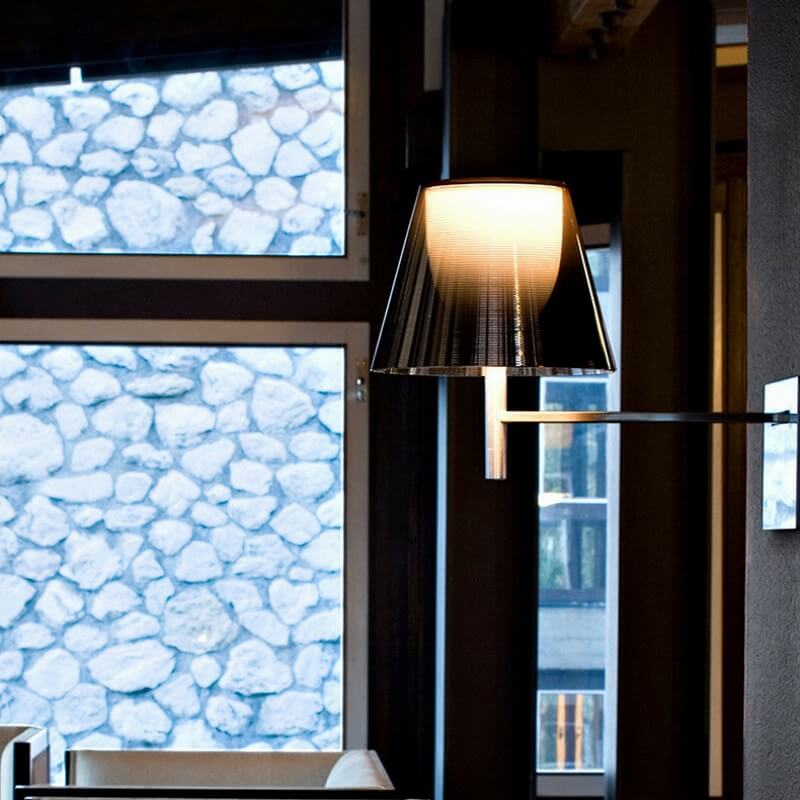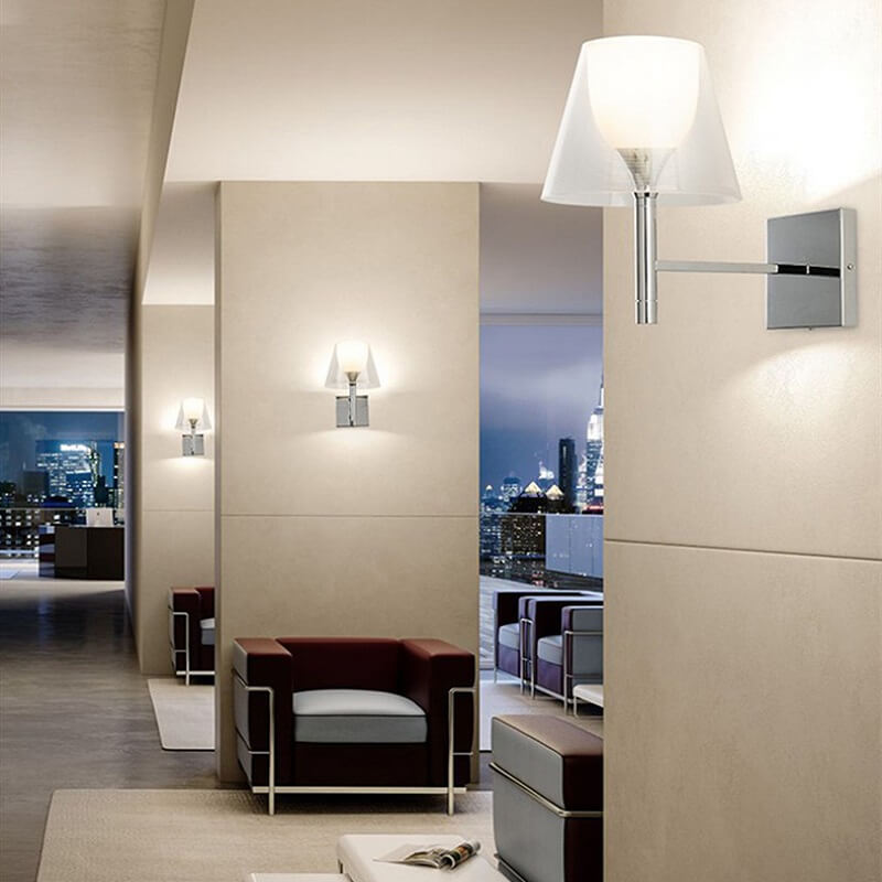 Lampa ścienna Flos Ktribe to eleganckie oświetlenie, które nadaje się szczególnie do dekoracji przestrzeni hotelowych, gdzie kunszt lampy zostanie doceniony przez klientów przyzwyczajonych do wysokiego standardu. Kinkiet jest połączeniem nowoczesnego stylu z elegancją. Całe piękno lampy uwydatnia się po jej włączeniu. Wewnętrzny dyfuzor w kształcie kielicha dominuje transparentną powłokę klosza, która sprawia wrażenie otulającego szala. Abażur lampy wykonany z akrylu w ciągu dnia estetycznie mieni się w blasku słońca, pełniąc funkcję ozdoby ściennej.