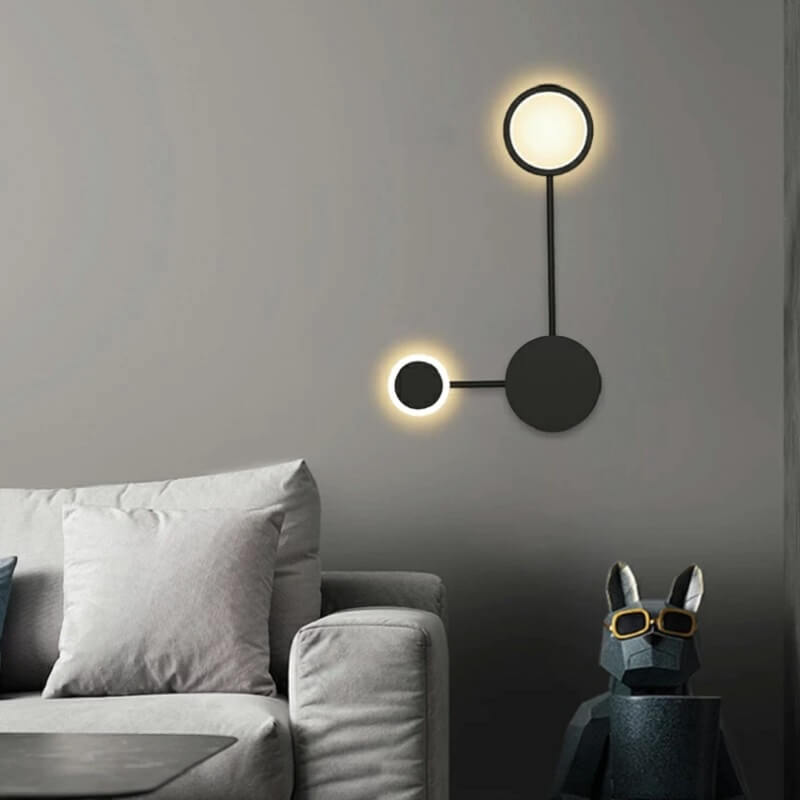 Nowoczesna geometryczna lampa ścienna wykonana z metalu i aluminium w różnych kolorach. Kinkiet można zawiesić również na suficie w formie plafonu. Okrągłe klosze skrywają źródło światła, dzięki czemu strumień świetlny odbija się od ściany. Oprawa tworzy efekt padającego cienia, co jednocześnie w przyjemny sposób oświetla pomieszczenie.