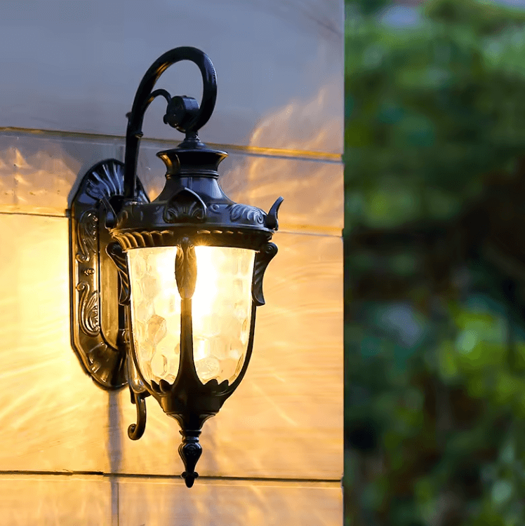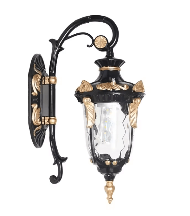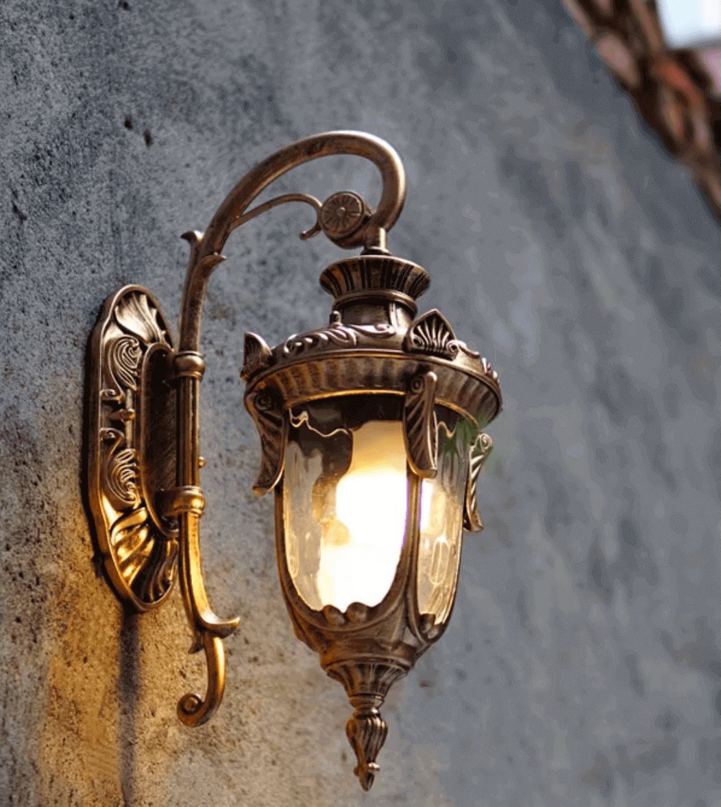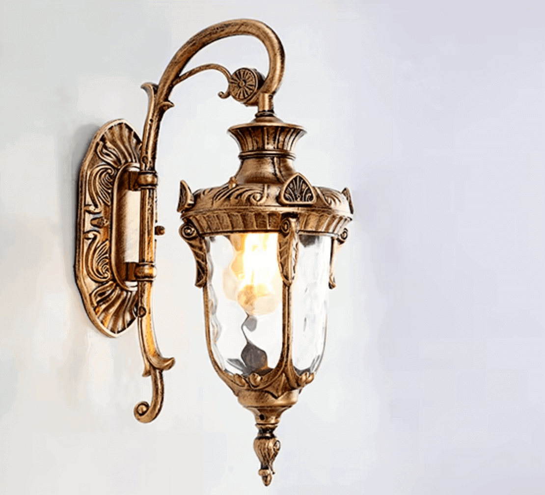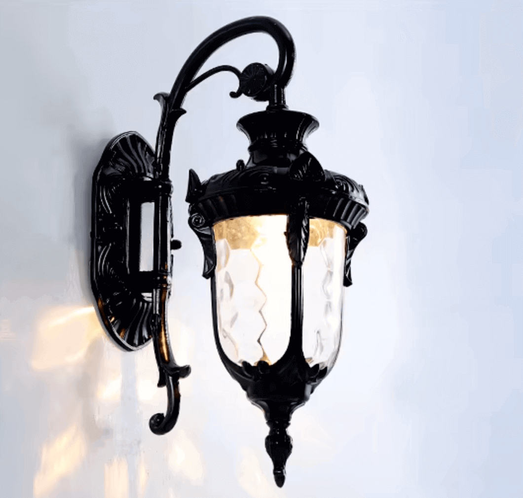 Ta lampa ścienna zachwyca eleganckim i bogato zdobionym designem w stylu retro. Dominują tu ornamenty w stylu barokowym, a kształt latarni przypomina antyczne lampy gazowe. Dostępna w trzech wersjach kolorystycznych. Szkło o strukturze plastra miodu delikatnie rozprasza światło, tworząc ciepły, przytulny efekt. Idealna do eleganckich wejść, tarasów, werand lub jako oświetlenie przy drzwiach wejściowych w klasycznych domach. Może też być efektownym dodatkiem do ogrodowej altany lub ścieżki.