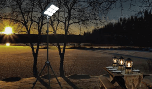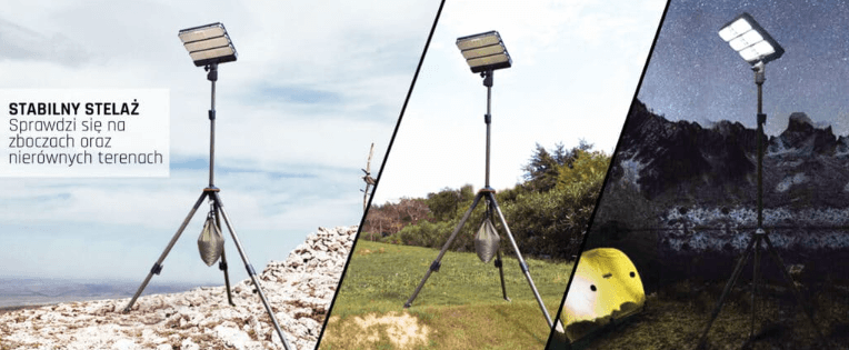 Lampa daje dużą widoczność i pozwala na swobodne korzystanie i oświetlenie sporej przestrzeni wokół namiotu lub kampera. Idealnie sprawdzi się zarówno w terenie jak i codziennym użytku wszędzie tam gdzie nie ma dostępu do energii. W zestawie znajduje się składany, teleskopowy stojak do lampy, ładowarka oraz walizka.