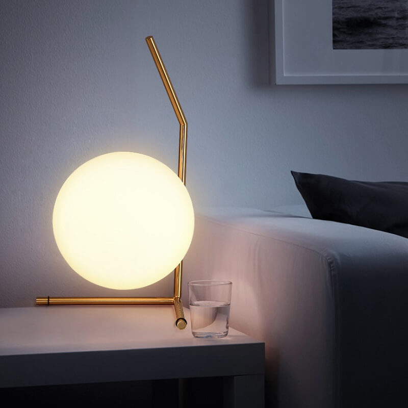 Minimalistyczna elegancka i stylowa złota lampa stołowa Flos w stylu art deco idealna do sypialni, gabinetu, salonu.