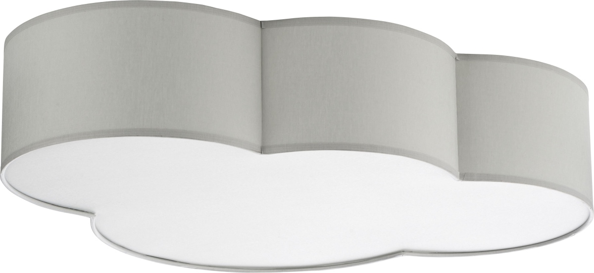 Lampa sufitowa Chmurka to urocza konstrukcja, która uatrakcyjni dziecięcy pokój, a zarazem będzie centralnym oświetleniem. Produkt kształtem przywodzi na myśl chmurę. Stanowi połączenie metalu oraz tworzywa, które osłania punkty świetlne, zapewniając delikatną oraz równomierną emisję blasku. Ponadto dokoła kształtu zamocowany został pasek z szarej tkaniny.