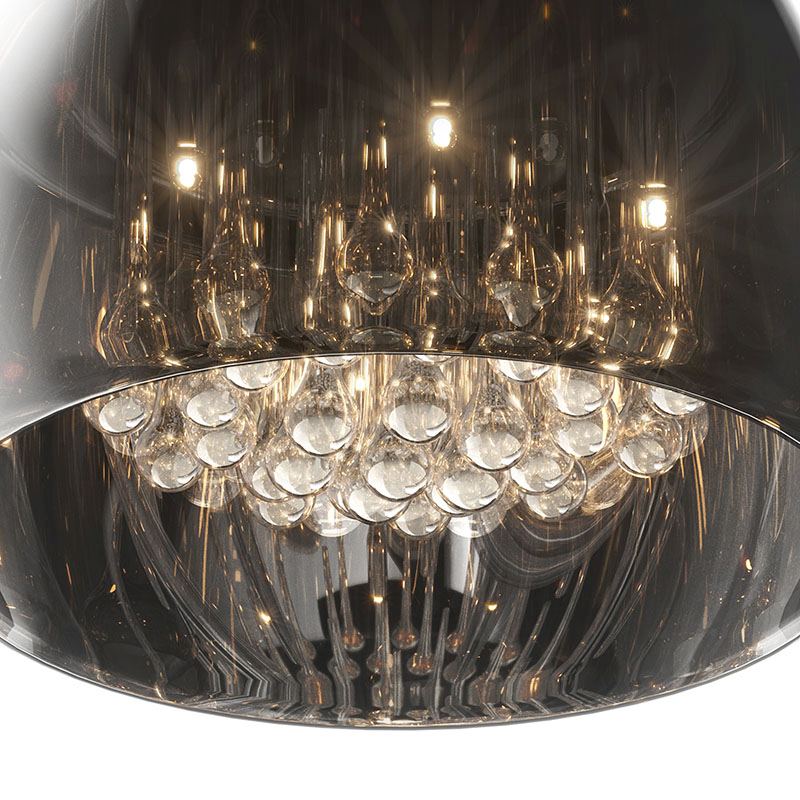 Elegancka lampa sufitowa Crystal ma za zadanie rozświetlić, a zarazem ozdobić wytworne wnętrza. Model posiada 5 lub 6 źródeł światła, otoczonych wiszącymi kryształkami, które zapewniają niezwykłą iluminację. Oprawa przy zgaszonym świetle fantastycznie lśni, zaś podczas pracy dymione od środka szkło staje się przezroczyste. Chromowane wykończenia, szkło i kryształki, nadają lampie jeszcze więcej szyku.