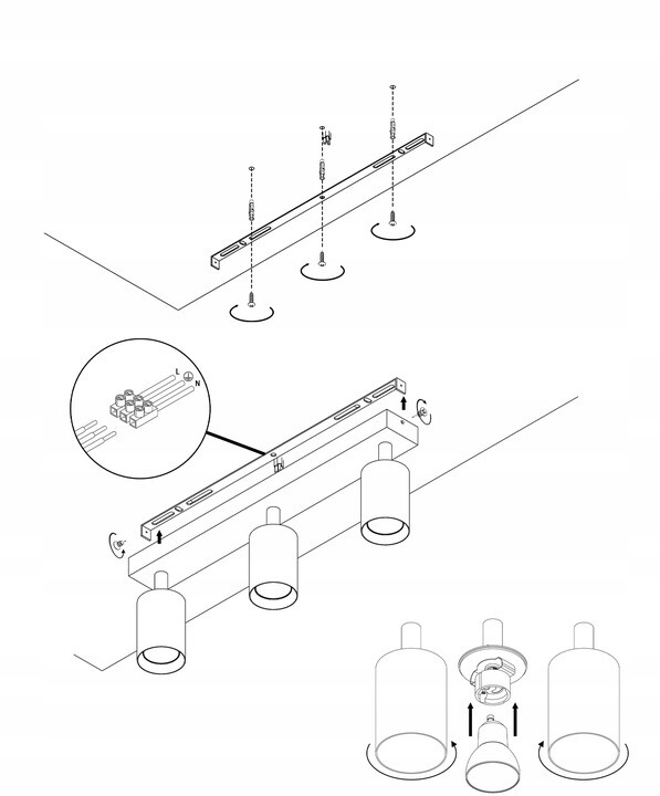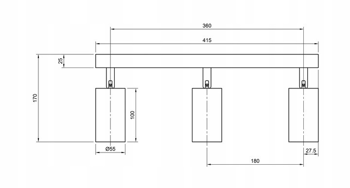 Sufitowa oprawa natynkowa spot przeznaczona dla żarówek GU10. Wykonana z aluminium, lakierowana na kolor czarny matowy z dodatkiem uchwytów w kolorze chrom. W komplecie znajdują się kołki montażowe.