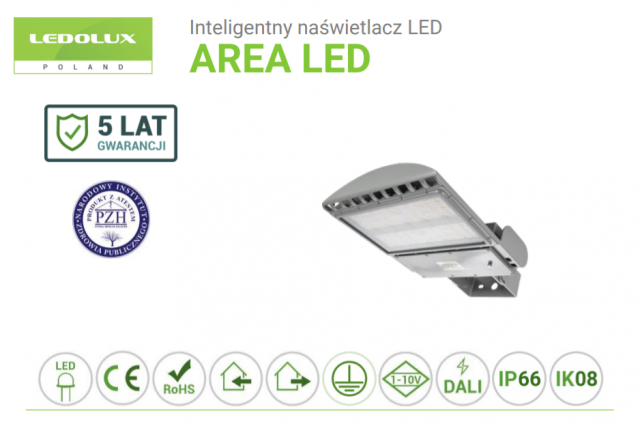 Lampy uliczne AREA LED producenta LEDOLUX posiadają certyfikat Higieniczny PZH, czyli dokument wydany przez Państwowy Zakład Higieny. Dzięki temu możemy ją wykorzystać miejscach o specyficznych uwarunkowaniach na przykład na halach, gdzie produkowane są leki.