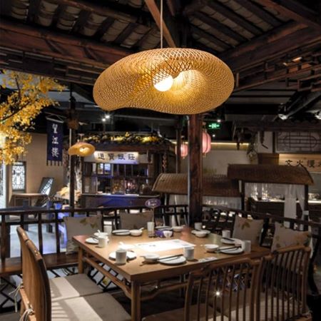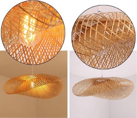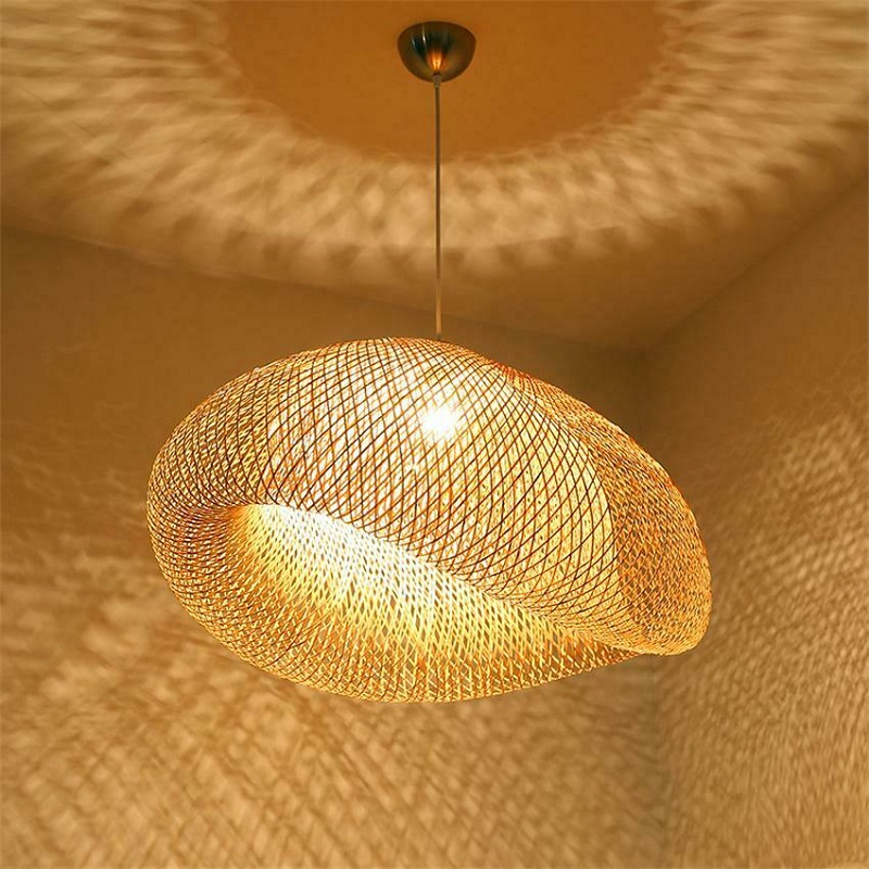 Klosz lampy wykonano z bambusowej plecionki. Pięknie nawiązuje do natury. Ażurowa forma lampy pozwala przenikać światłu dzięki czemu lampa daje piękną poświatę. Lampa świetnie wygląda umieszczona nad stołem w jadalni, nad sofą w salonie czy miejscem do pracy w domowym biurze.