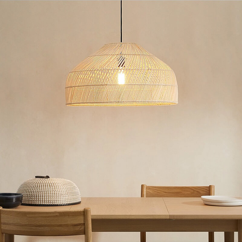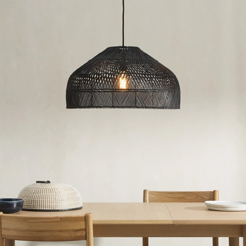 Naturalna minimalistyczna rattanowa lampa wisząca w stylu boho w kolorze beżowym i czarnym idealna do salonu, sypialni, jadalni.