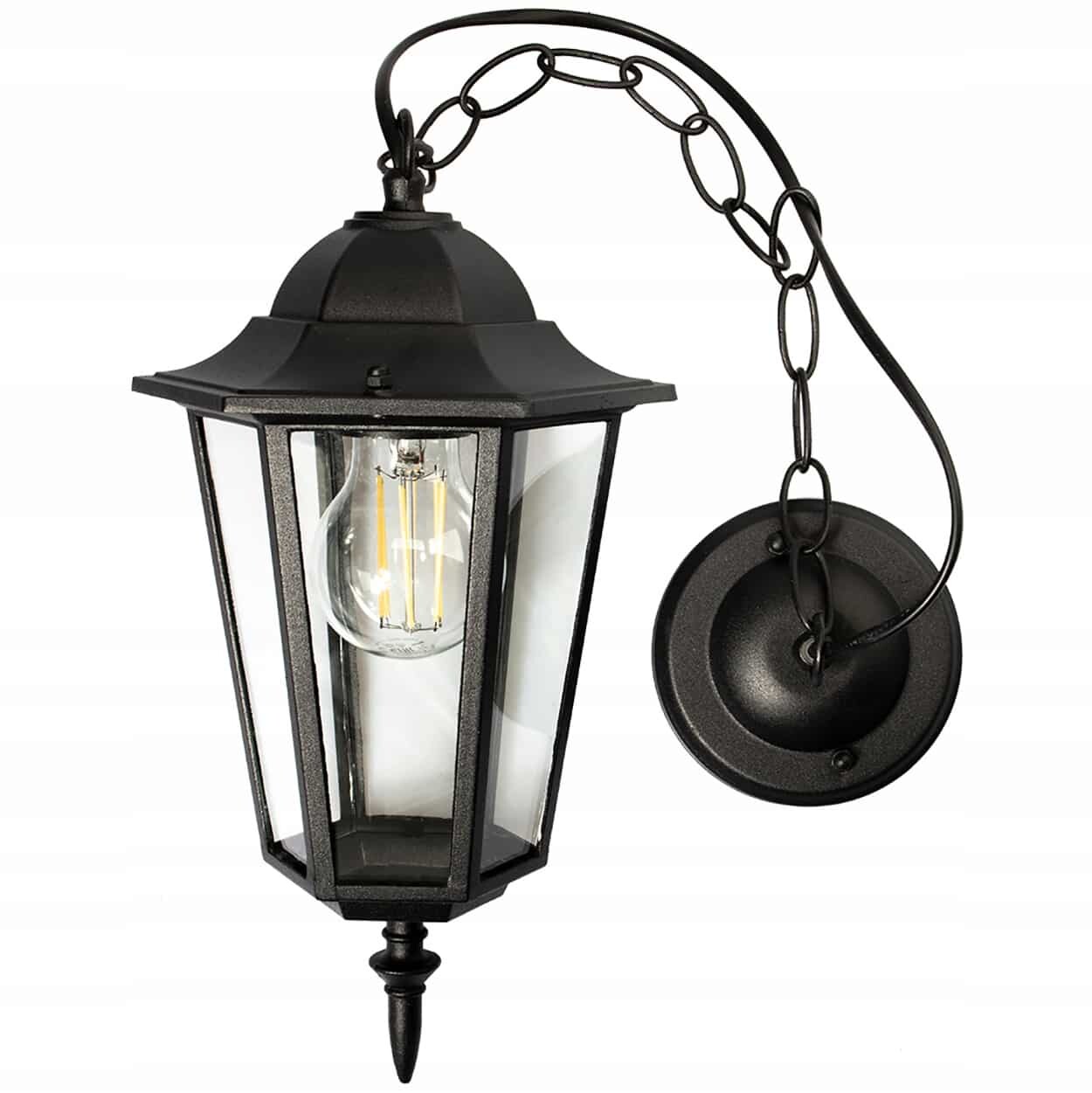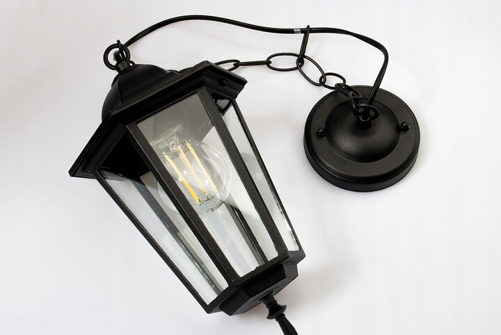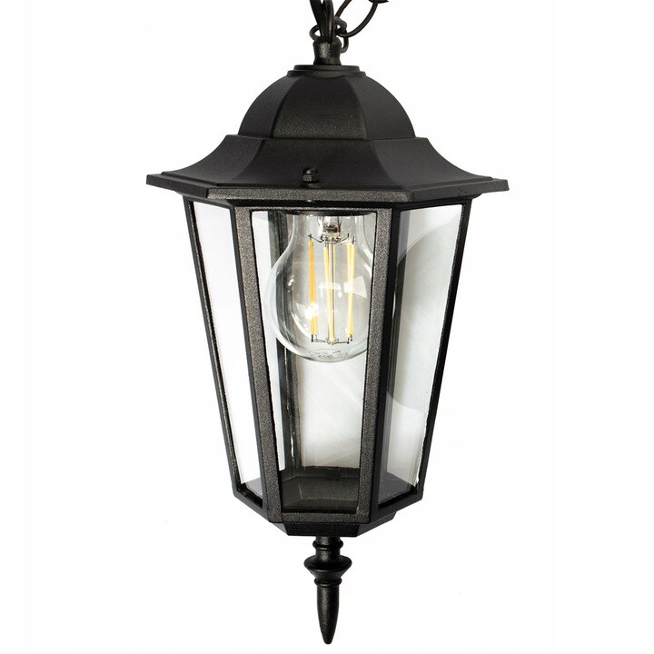 Lampa Wisząca zewnętrzna w kształcie latarni w kolorze czarnym, wykonana z wysokiej jakości stopu aluminium oraz szkła. Lampa z wymiennym źródłem światła została wyposażona w popularny trzonek E27 – maksymalna moc nie może przekraczać 12W w przypadku żarówki LED.
