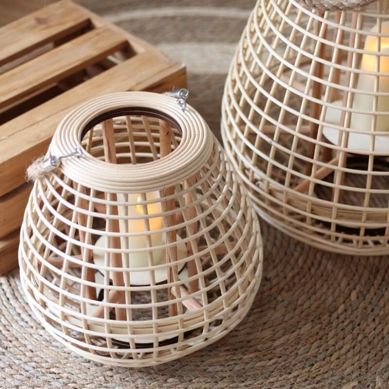 Lampion wiklinowy na nóżkach to piękny dodatek do aranżacji balkonu, tarasu czy ogrodu. Wykonany z naturalnych materiałów, dlatego idealnie komponować się będzie z rattanowymi meblami w stylu boho. Ze względu na swoją uniwersalną kolorystykę i ażurową formę, wpasuje się także w subtelne aranżacje, których bazę stanowią naturalne akcenty z drewna, rattanu czy wikliny. Lampę zrobiono z cienkich bambusowych listewek ułożonych symetrycznie w spójną całość o obłych kształtach. Naturalny kolor rattanu i drewna sprawia, że całość stanowi uniwersalny dodatek.