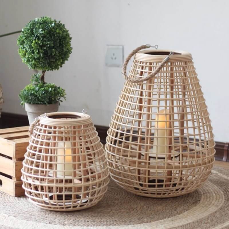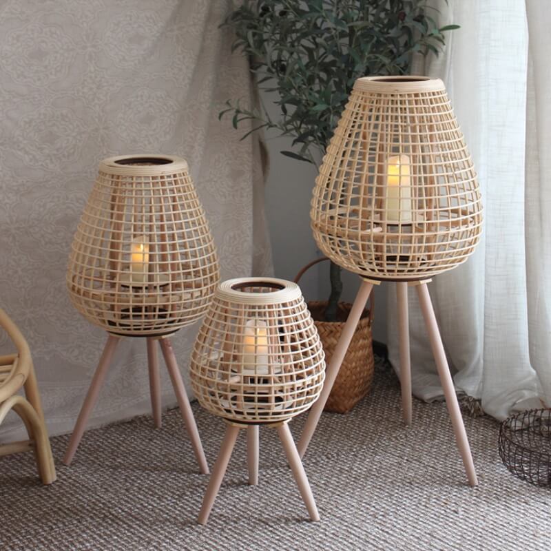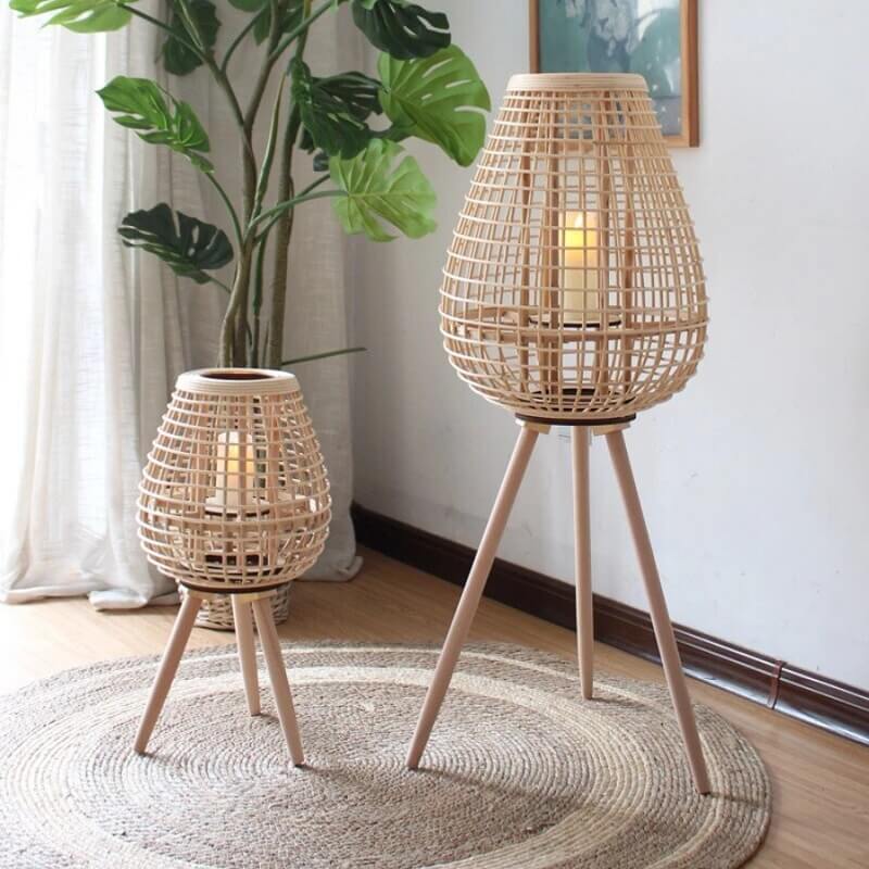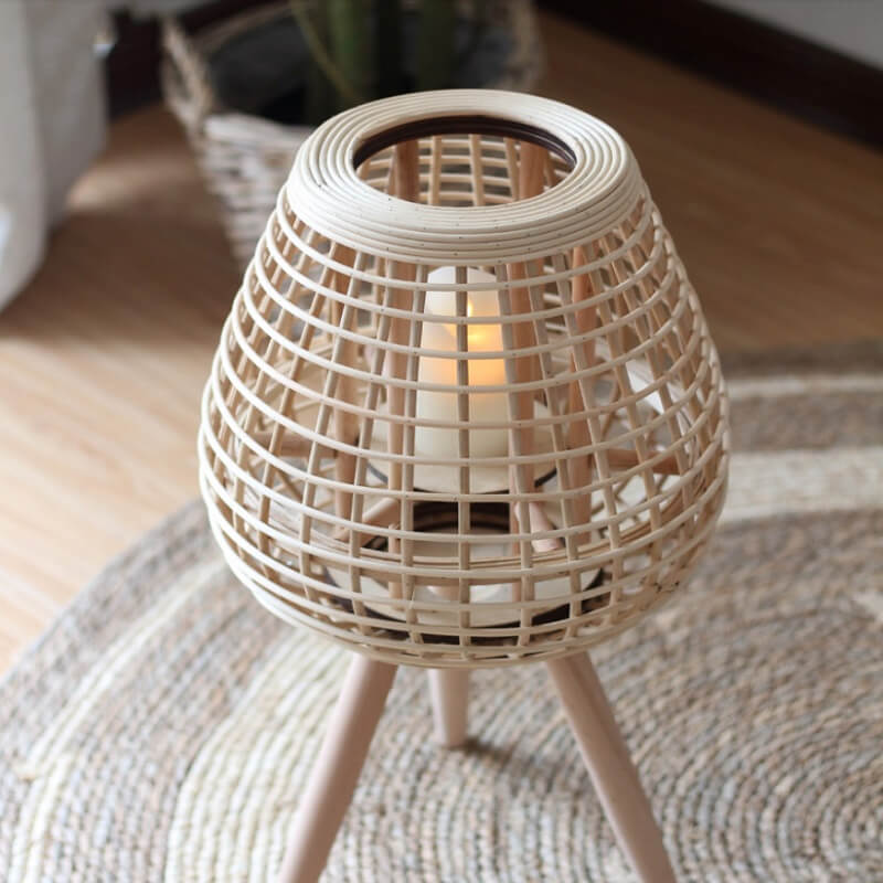 Naturalny wiklinowy lampion stojący na nóżkach w stylu boho idealny do salonu, ogrodu, na taras.