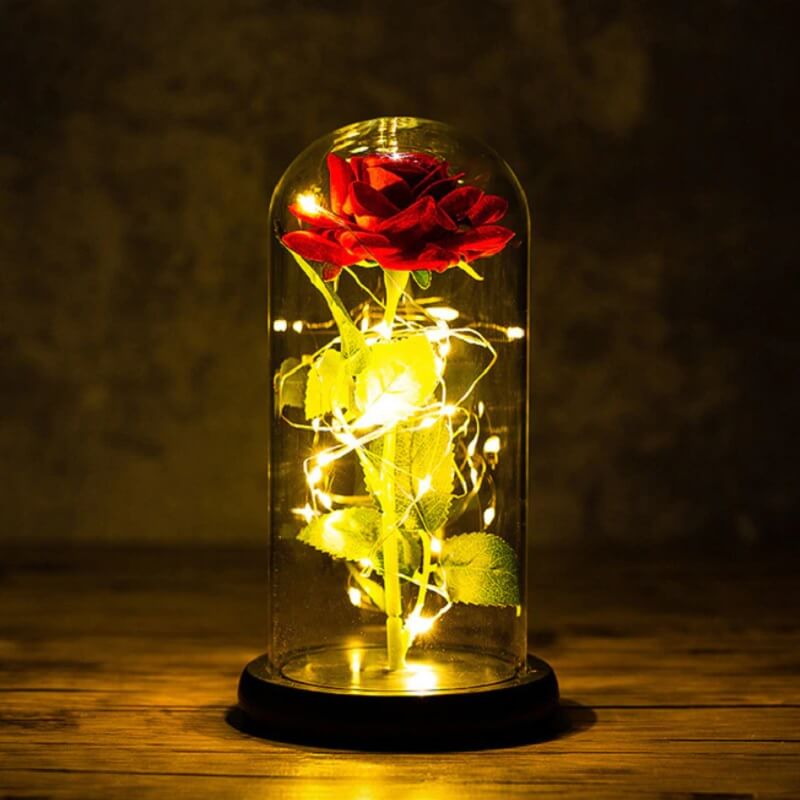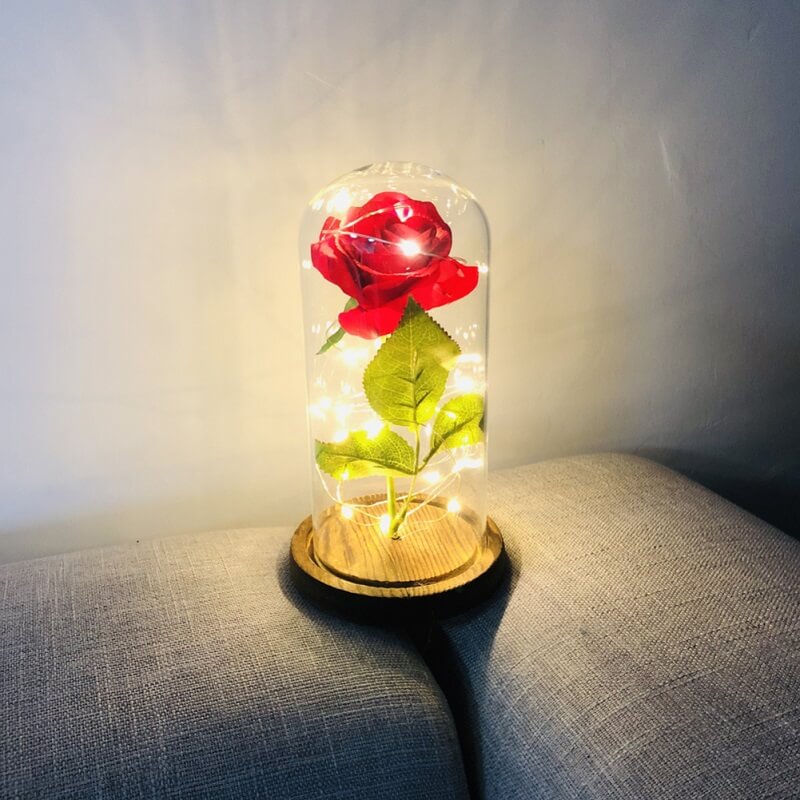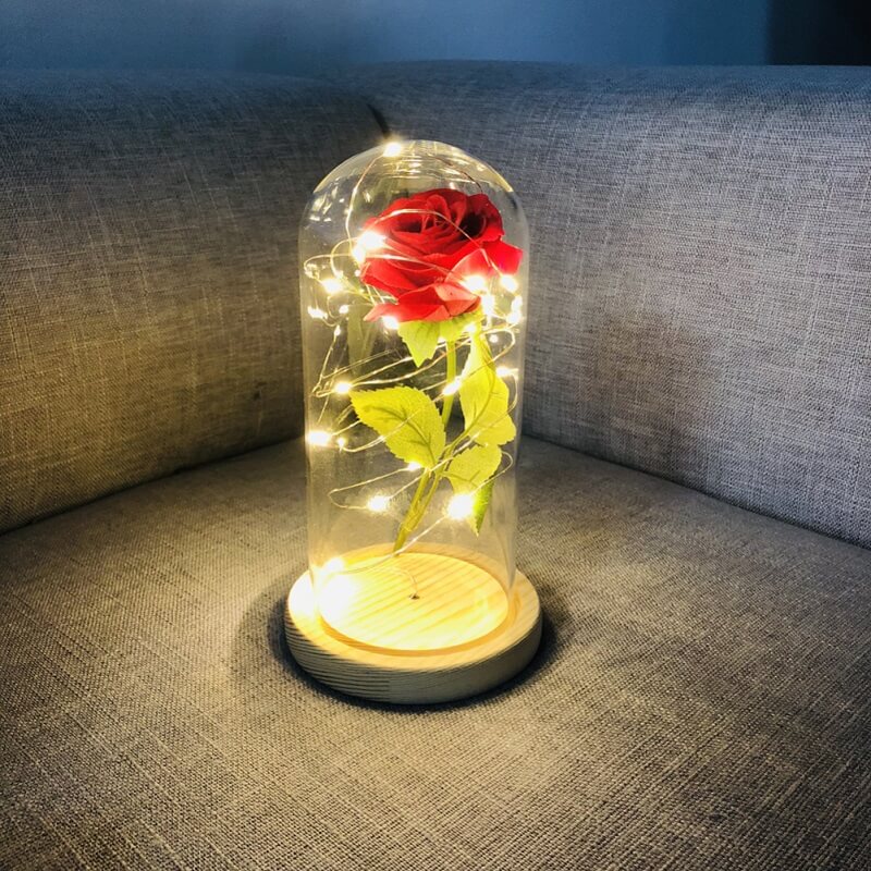 Przepiękna róża, idealna by obdarować swoją ukochaną osobę. Nada się na każdą okazję, ze względu na swój uniwersalny klimat. Róża jest w kolorze czerwonym, a dzięki temu, że jest sztuczna, nacieszy ona oko obdarowanego przez długie lata! Drewniana podstawka idealnie kontrastuje z czerwienią róży, a szklana kopuła dodaje wrażenia wieczności prezentu oraz dodatkowo chroni różę przed zabrudzeniami. Światełka w środku przepięknie odbijają się od szklanej kopuły dodając uroku produktowi. Prezent, poza tym, że piękny, znajdzie swoje zastosowanie również jako lampka nocna.