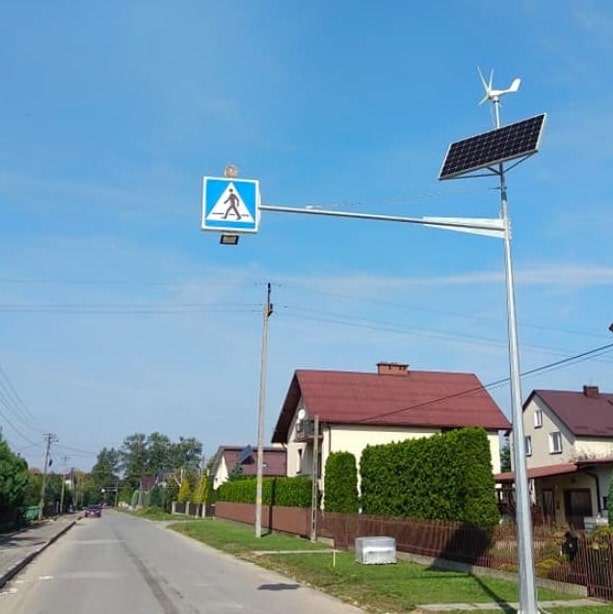 Hybrydowe oświetlenie solarne, zasilane energią słoneczną i wiatrową do oświetlenia przejścia dla pieszych. Łatwa do zainstalowania latarnia wiatrowo-solarna LED posiada inteligentny system zarządzania – jest doskonałym źródłem światła, a jej działanie nie wymaga ingerencji człowieka oraz prac ziemnych koniecznych do położenia długich przewodów zasilających. Lampa w całości energię pobiera z promieni słonecznych i wiatru, a jej nadmiar magazynuje wykorzystując w dni pochmurne i bezwietrzne.