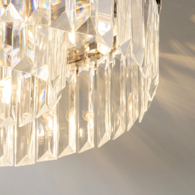 Plafon kryształowy glamour Crystal łączy w sobie wyjątkowy i ponadczasowy design w najlepszym wydaniu, co stwarza szereg możliwości aranżacji przestrzeni w Twoim domu. Oświetlenie z łatwością wkomponuje się w pomieszczenia o klasycznym i nowoczesnym klimacie. Lampa cechuje się funkcjonalnością, a jej uniwersalna forma sprawi, że blask jej światła wprowadzi komfortową i przytulną atmosferę sprzyjającą spotkaniom towarzyskim, jak i odpręży po dniu spędzonym poza domem w spokojne wieczory z najbliższymi. Model Crystal jest wykonany z praktycznych i trwałych materiałów, gwarantując jego użytkownikom radość i zadowolenie na wiele lat. Gustowny kolor chrom lampy sprawi, że sprawdzi się ona zarówno w jasnych, jak i ciemnych wnętrzach. Materiały zastosowane w lampie to kryształ oraz metal, dzięki temu będzie ona łatwa w pielęgnacji i w utrzymaniu czystości.