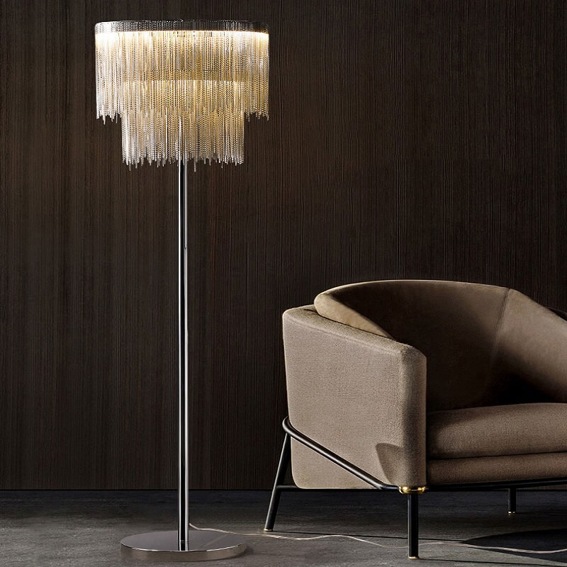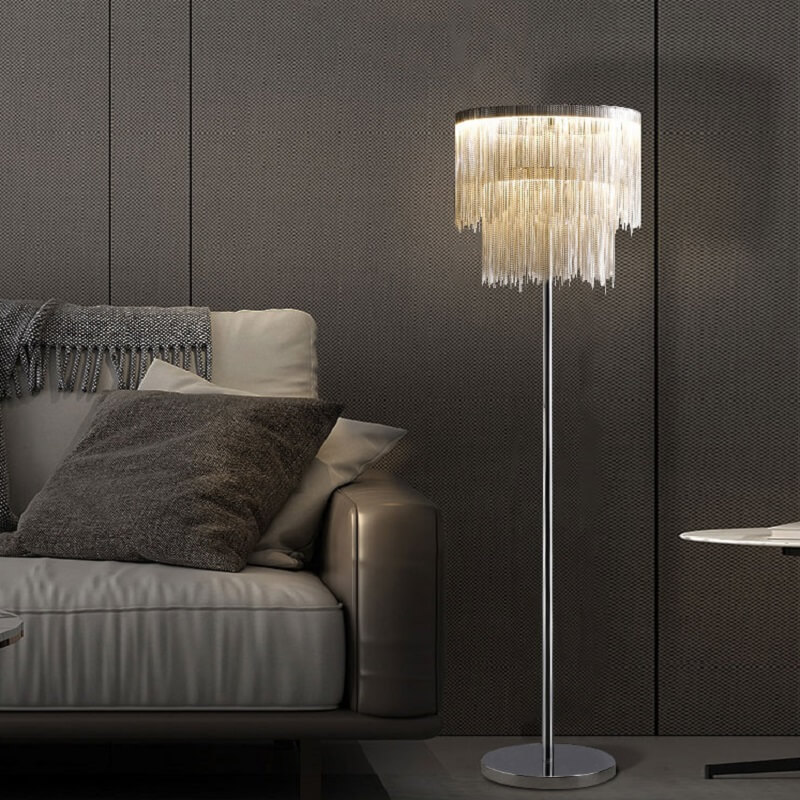Designerska lampa podłogowa Endon Zelma to srebrna podstawa, na której osadzono dekoracyjne, srebrne łańcuszki oświetlone wbudowanym panelem led. Taki efektowny dodatek sprawdza się doskonale zarówno we wnętrzach w stylu art deco, jak i nowoczesnych aranżacjach z delikatnymi nutami klasyki. Lampa daje delikatne, dekoracyjne światło, które pięknie rozpraszają srebrne łańcuszki. Jest to doskonały wybór do dodatkowego oświetlenia dekoracyjnego w salonie, w domowym gabinecie lub w eleganckiej sypialni. Panel led daje ciepłe światło sprawiając, że wnętrze oświetlone lampą Zelma jest nie tylko eleganckie, ale też bardzo przytulne. Model ten docenią osoby, które lubią efektowne dodatki tworzące przytulną atmosferę.