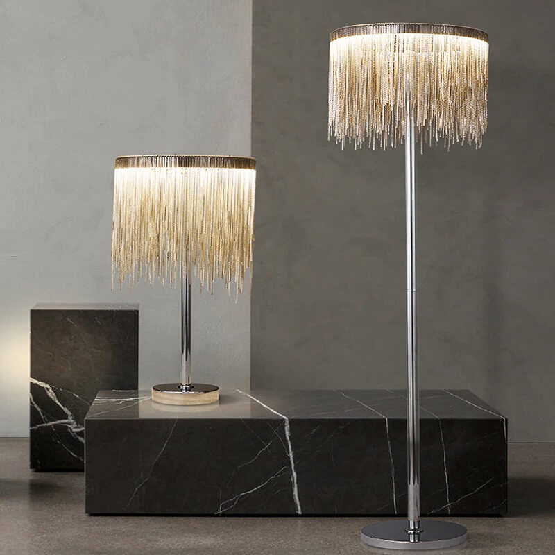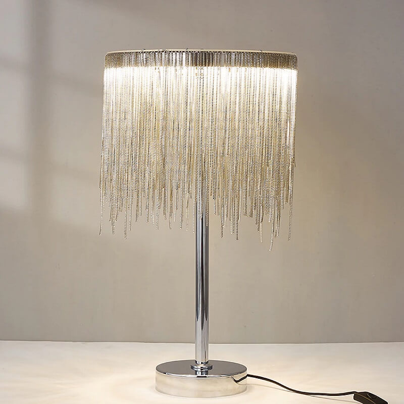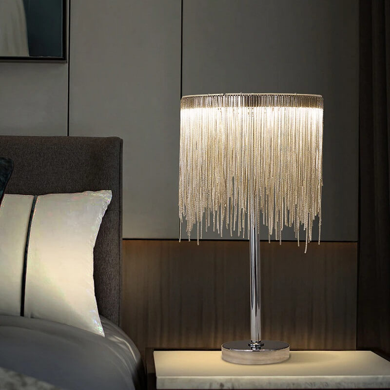 Designerska lampa stołowa Endon Zelma to srebrna podstawa, na której osadzono dekoracyjne, srebrne łańcuszki oświetlone wbudowanym panelem led. Taki efektowny dodatek sprawdza się doskonale zarówno we wnętrzach w stylu art deco, jak i nowoczesnych aranżacjach z delikatnymi nutami klasyki. Lampa daje delikatne, dekoracyjne światło, które pięknie rozpraszają srebrne łańcuszki. Jest to doskonały wybór do dodatkowego oświetlenia dekoracyjnego w salonie, w domowym gabinecie lub w eleganckiej sypialni. Panel led daje ciepłe światło sprawiając, że wnętrze oświetlone lampą Zelma jest nie tylko eleganckie, ale też bardzo przytulne. Model ten docenią osoby, które lubią efektowne dodatki tworzące przytulną atmosferę.
