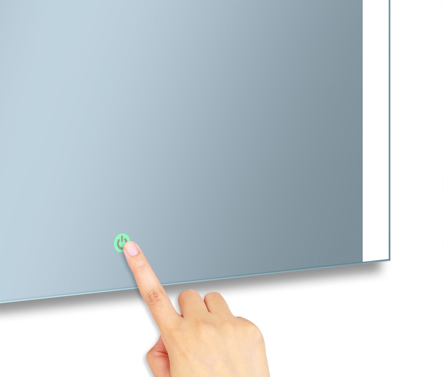 Włącznik dotykowy: Włącznik dotykowy GRBL o zielonej barwie podświetlenia z ikoną power. Kolor podświetlenia sensora w momencie włączenia oświetlenia lustra zmienia barwę na błękitną. Zielony jest tylko w trybie czuwania. Posiada własne podświetlenie LED, dzięki czemu bez problemu zlokalizujesz go w ciemnym pomieszczeniu. Włącznik uruchamia oświetlenie lustra za jednym dotknięciem palca. Dodatkowo ten model został wyposażony w niezwykle energooszczędną funkcję samoczynnego wyłączenia oświetlenia po 30 minutach od uruchomienia. Średnica włącznika to 1,5 cm.