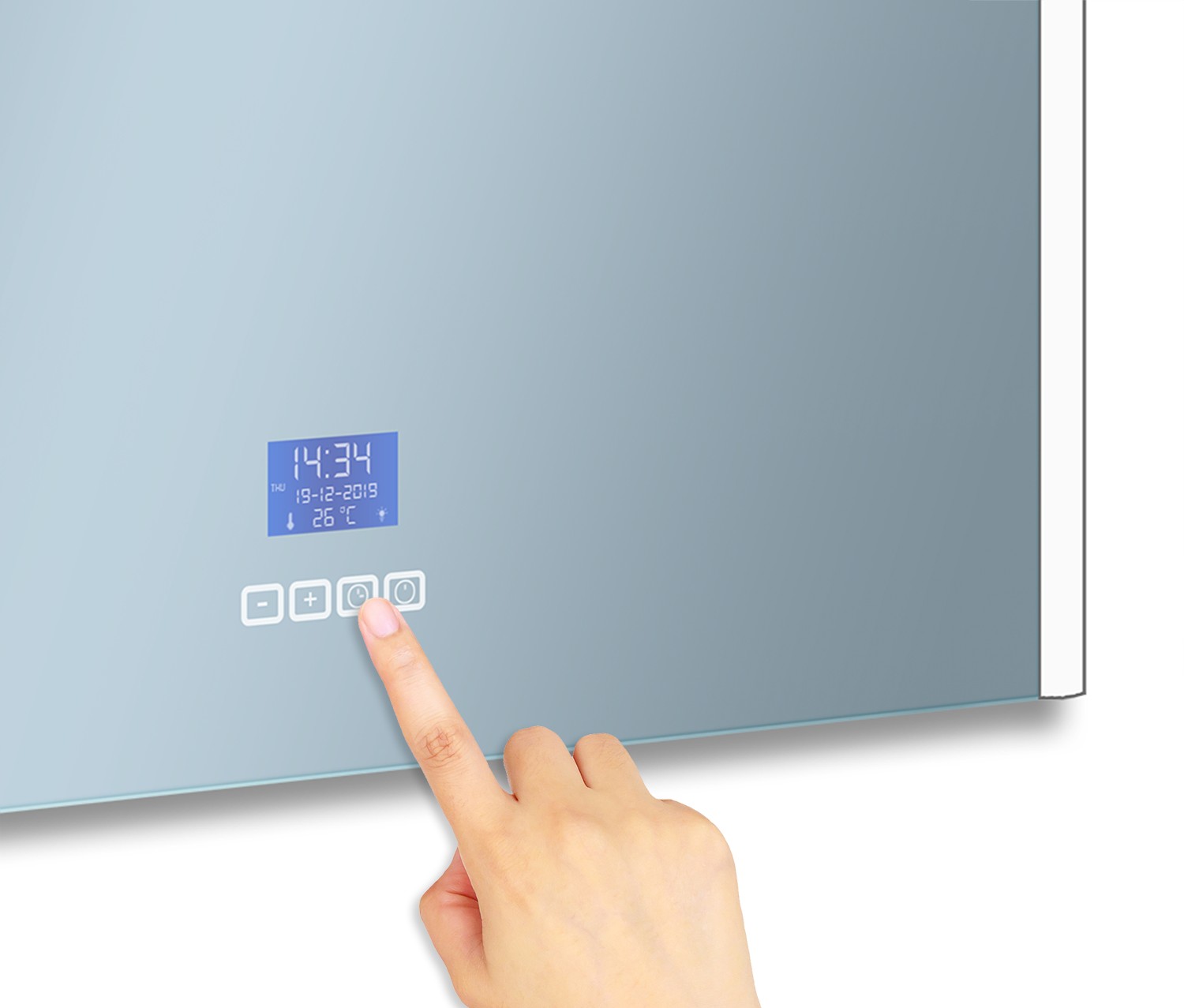 Stacja LCD: Elektroniczny wyświetlacz LCD wskazuje datę, godzinę, dzień tygodnia oraz temperaturę wewnątrz pomieszczenia w stopniach Celsjusza. Na tafli lustra znajduje się wyświetlacz o wymiarach 5cm x 3cm, tło wyświetlacza ma barwę błękitną z białymi cyframi i ikonami. Pod wyświetlaczem znajduje się panel z przyciskami: włącznikiem dotykowym uruchamiającym oświetlenie lustra za jednym dotknięciem palca oraz przyciskami funkcyjnymi do ustawiania parametrów wyświetlacza. Wyposażony jest również w opcje czuwania, wyłączy oświetlenie lustra po upływie 30 minut bezczynności. Wielkość przycisków to 1,5 cm x 1 cm. Ikona z zegarkiem służy do zmiany daty, godziny oraz dnia tygodnia, aby włączyć tryb zmiany daty należy przytrzymać tę ikonkę, każde kolejne wciśnięcie tego przycisku pozwoli na zmianę pozostałych parametrów przy użyciu (+ -).