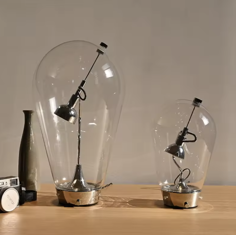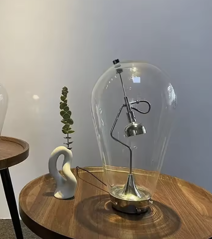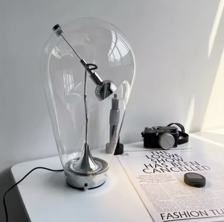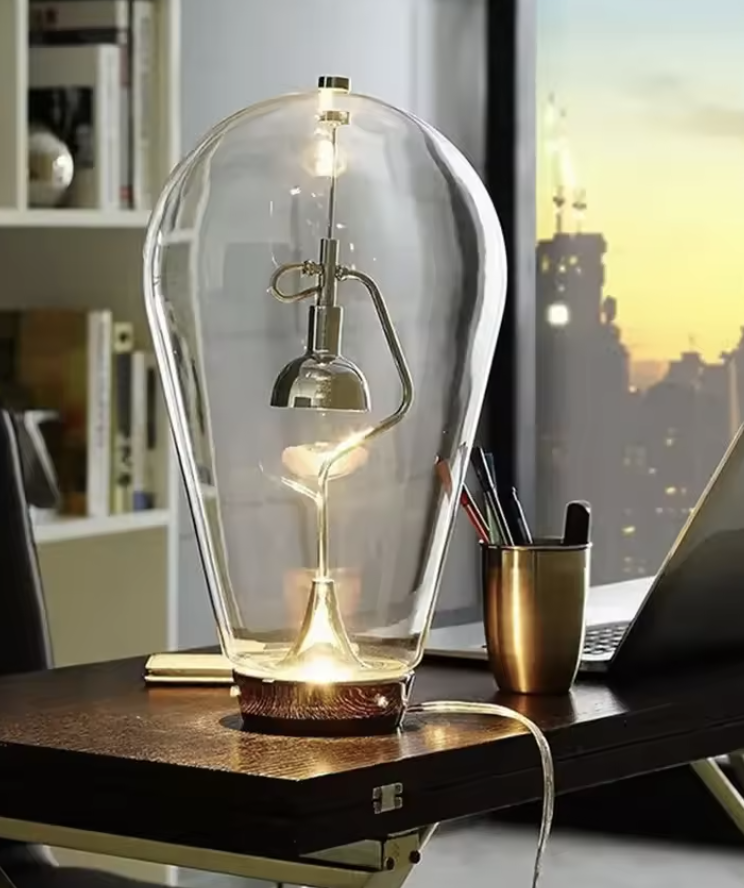 Lampa biurkowa vintage o oryginalnym wyglądzie przypominającym dużą żarówkę, wewnątrz której zamontowano mniejszą metalową lampkę nocną. Będzie nie tylko dodatkowym źródłem światła, ale też niebanalną ozdobą pomieszczenia. Świetnie sprawdzi się w salonie, sypialni, czy gabinecie, urządzonych w stylu industrialnym, ale także w nowoczesnych lub loftowych przestrzeniach. Idealna również jako lampa do kawiarni, restauracji, czy pubu. Magnes umieszczony na zewnątrz lampy pozwala łatwo manipulować źródłem światła wewnątrz, dzięki czemu można dowolnie ustawić kąt padania światła.