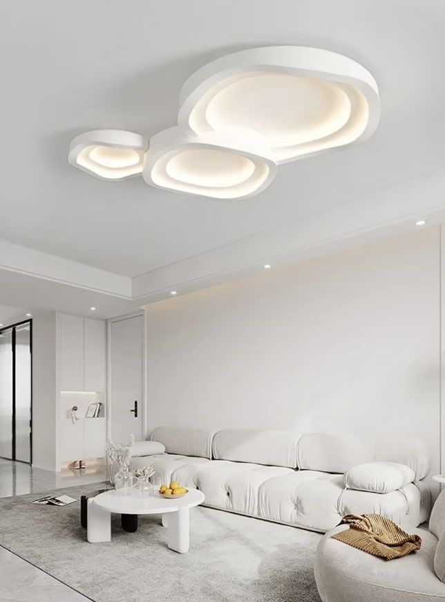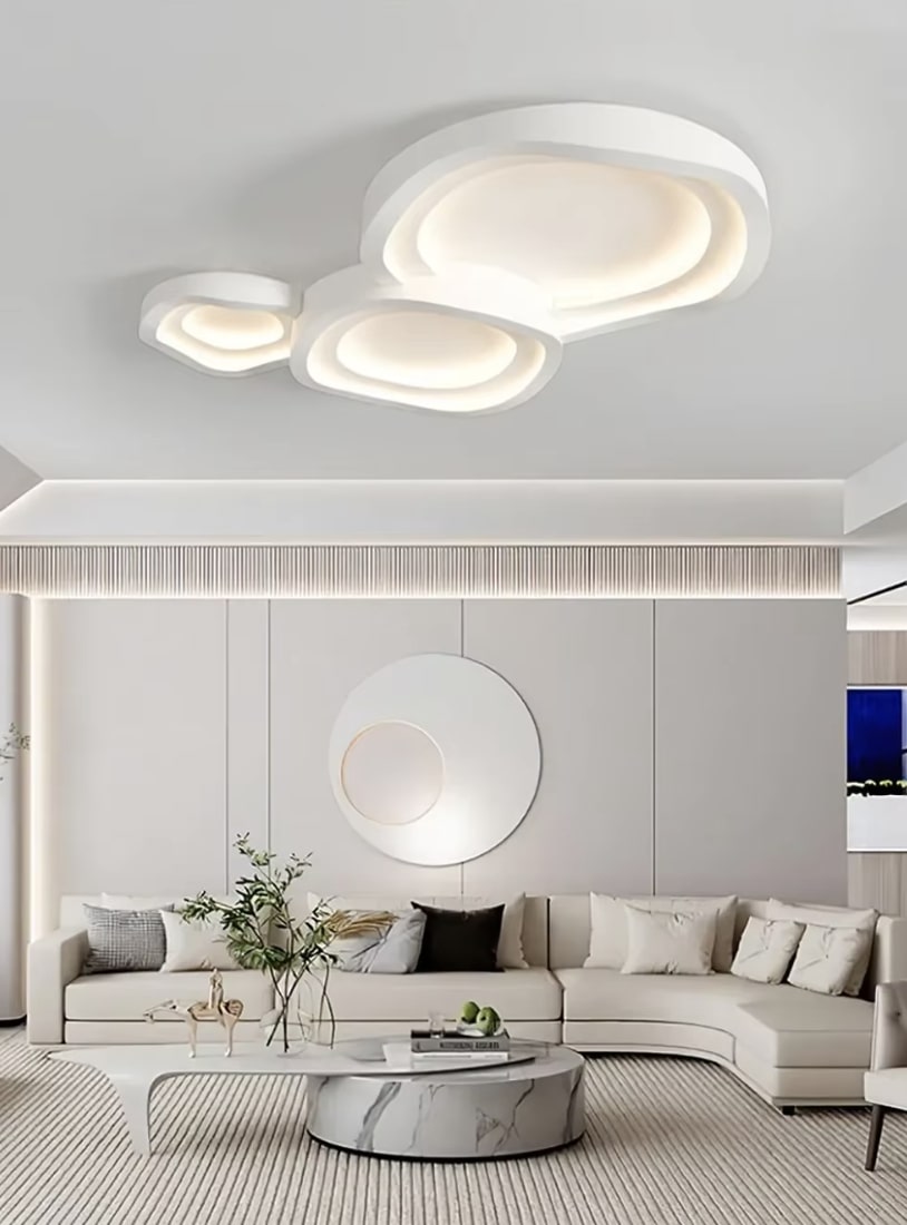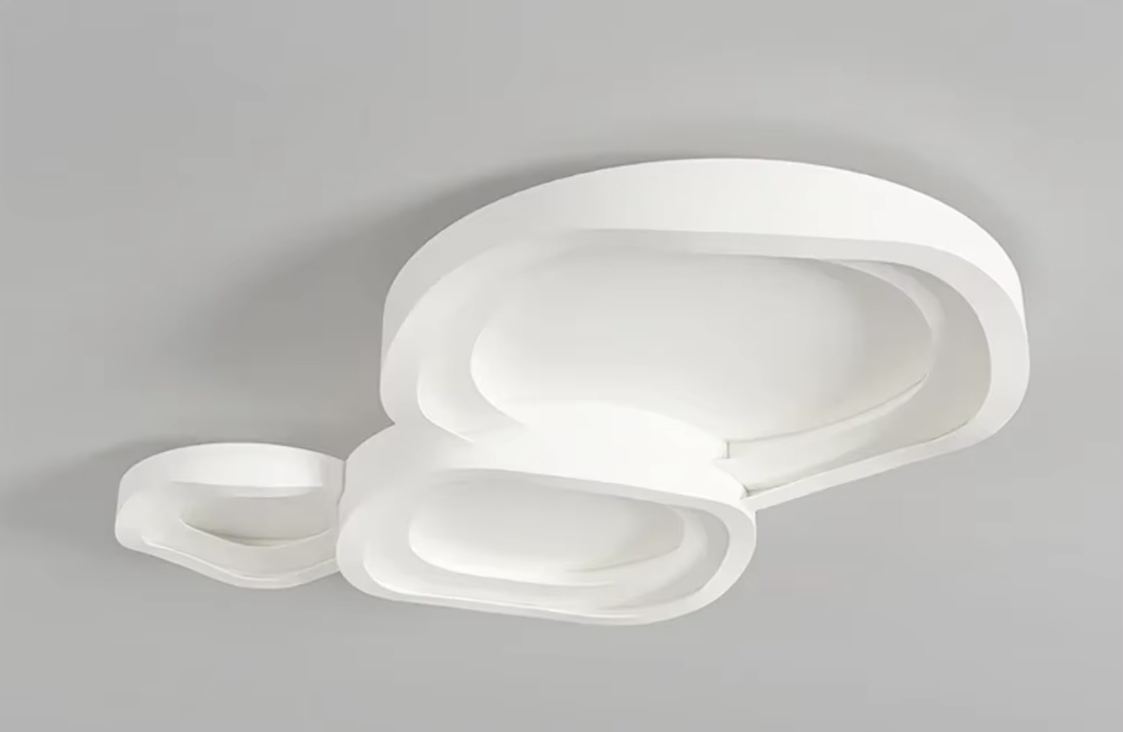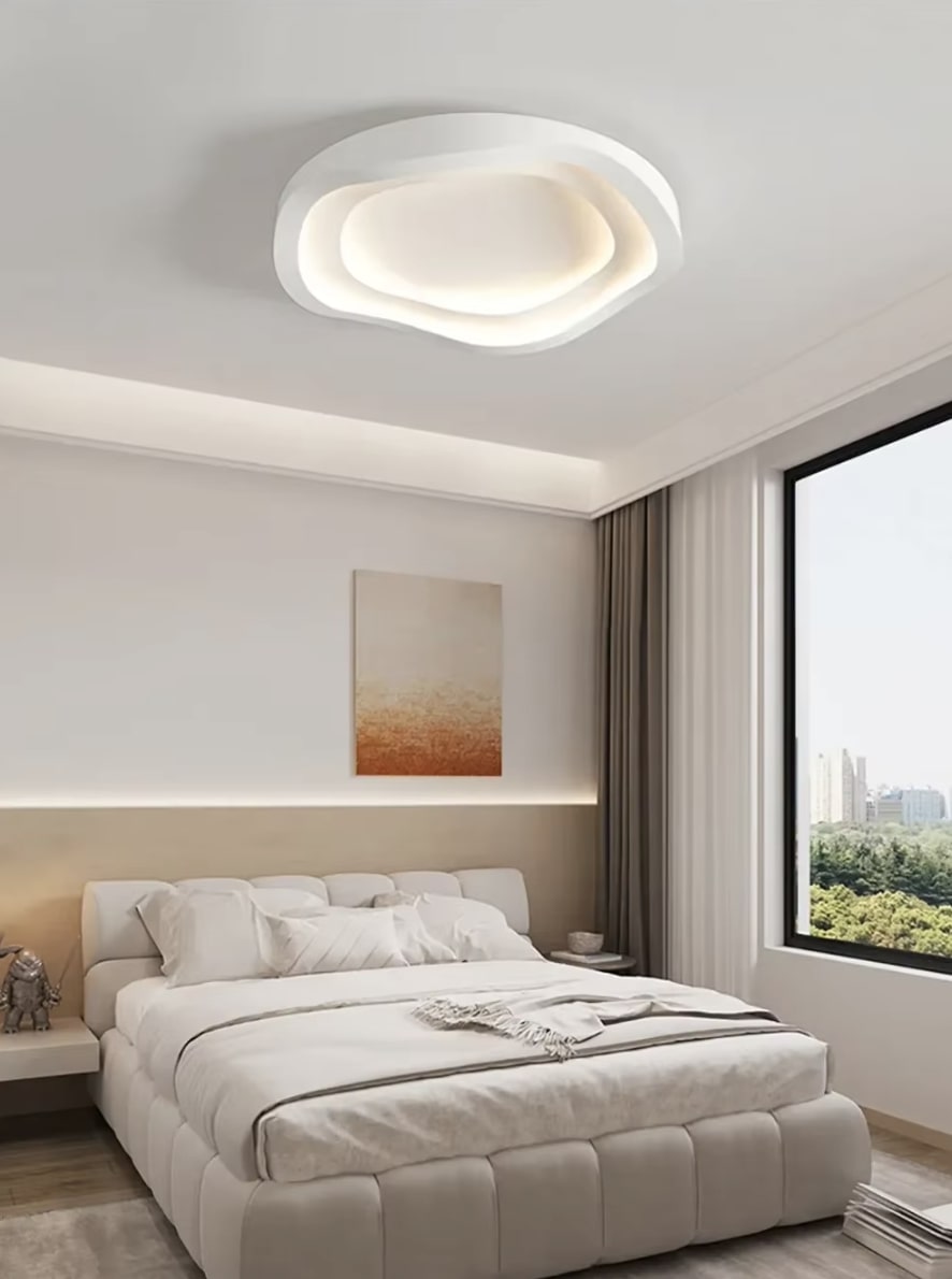 Kształt oprawy przypomina nałożone na siebie, nieregularne, zaokrąglone formy, co tworzy efekt przestrzeni i głębi na suficie. Jasne wykończenie ze światłem LED rozchodzącym się delikatnie po obwodach warstw i dającym miękkie, rozproszone światło buduje przytulną atmosferę w każdym pomieszczeniu. Lampa dla osób ceniących spokojny, harmonijny design oraz naturalne inspiracje i które chcą, aby oświetlenie było nie tylko praktyczne, ale i dekoracyjne. Będzie idealną ozdobą pomieszczeń w stylu nowoczesnym, minimalistycznym, świetnie wkomponuje się także we wnętrza skandynawskie, organiczne, modern, czy japandi.