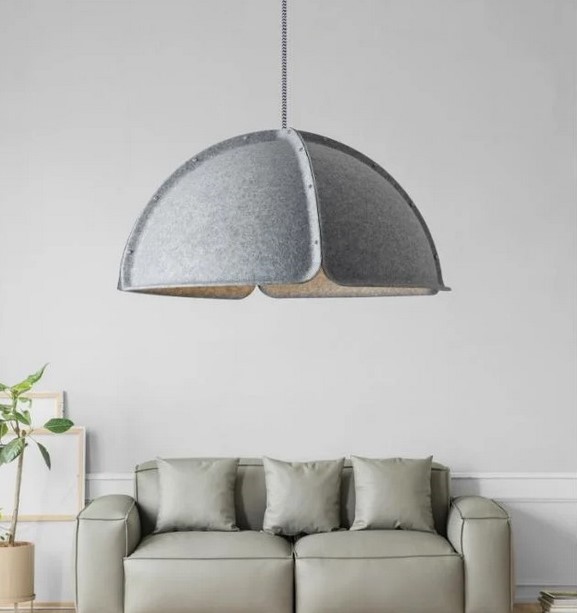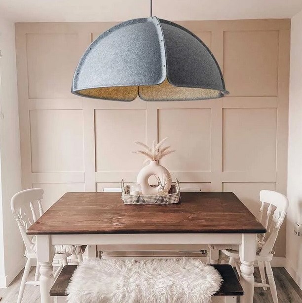 Klosz lampy wiszącej Bell wykonany z wysokiej jakości filcu, obszyty tkaniną w kolorze szarym i beżowym. Lampa o bardzo ciekawym kształcie przypominającym elegancki kapelusz. Nowoczesny design perfekcyjnie łączy się z praktycznymi właściwościami akustycznymi. Dzięki półokrągłej formie i szerokiej średnicy lampa tłumi dźwięki nadając przyjemny spokój przestrzeni, w której się znajduje.